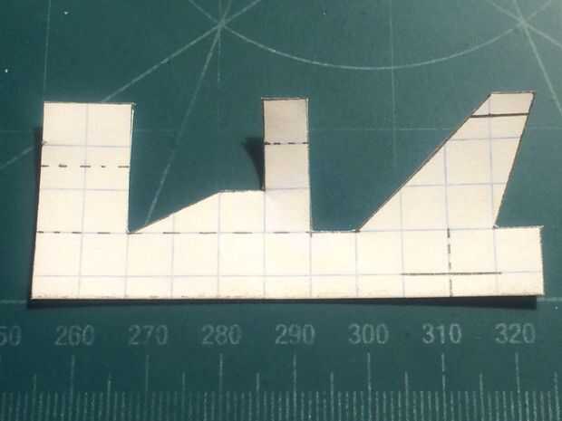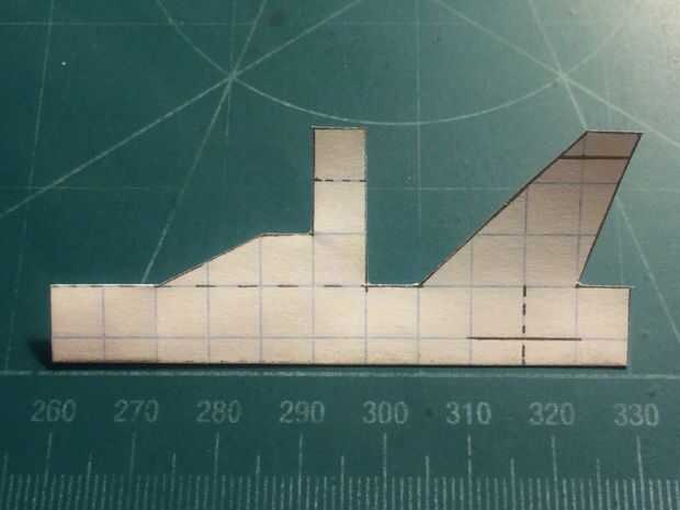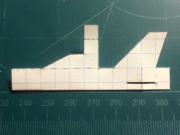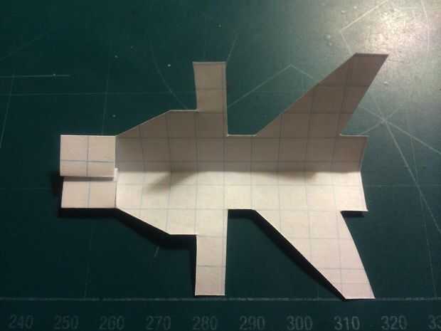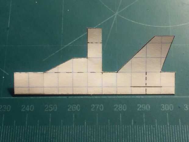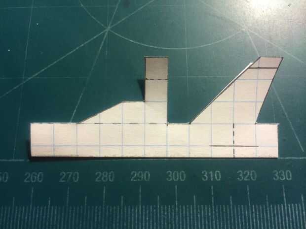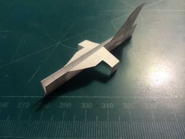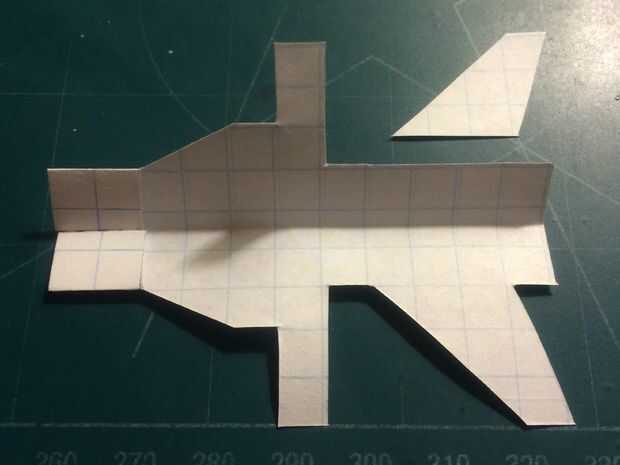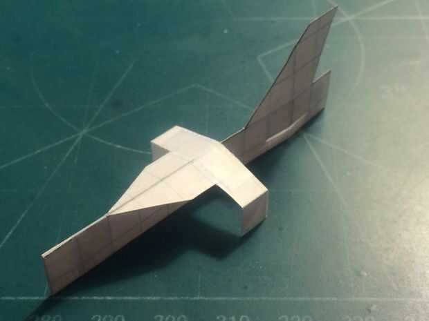 Empezar a hacer el fuselaje de su fuselaje lo cortando y doblando el contrapeso. A continuación, cortar uno de los estabilizadores verticales y plegar el tren de aterrizaje y mástiles. Una vez hecho esto, el estabilizador vertical hacia adelante a lo largo de la línea vertical punteada del doblez y corte a lo largo de la línea horizontal como se muestra. A continuación se despliegan. Una vez este finalizado, cinta de designado.