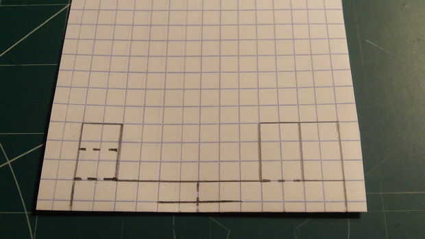 En primer lugar, comenzar por plegamiento eres tu papel milimetrado en la mitad (excepto tres cajas en el lado perforado). Una vez que el papel ha sido doblado adecuadamente, haga dos marcas--13 cajas full apart. Use una regla para hacer una línea recta con una longitud de 13 cajas directamente a 1 fila de cajas de las dos marcas que acaba de hacer. Luego realizar los elevadores, timón y contrapeso como se indica. Siga las marcas de la fotografía. Entonces, dos cajas de la parte trasera del contrapeso, marque una línea que se extiende 4 cajas más atrás. 2 cajas desde el comienzo de esta línea, hacer una línea de puntos vertical. Una vez que todo está marcado hacia fuera, cortar el fuselaje.