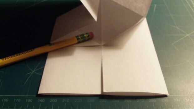Plegar el papel con el pliegue medio de la tapa de cubierta la línea de centro de reunión. Luego desplegar y plegar el papel de la sección más externa de la izquierda hacia el interior a lo largo de su pliegue. Luego doblar el pliegue de la tapa abajo, arrugando el borde en el extremo del ala. Repita en el otro lado. Una vez preparados ambos lados, doble hacia abajo la tapa de la cubierta entera.