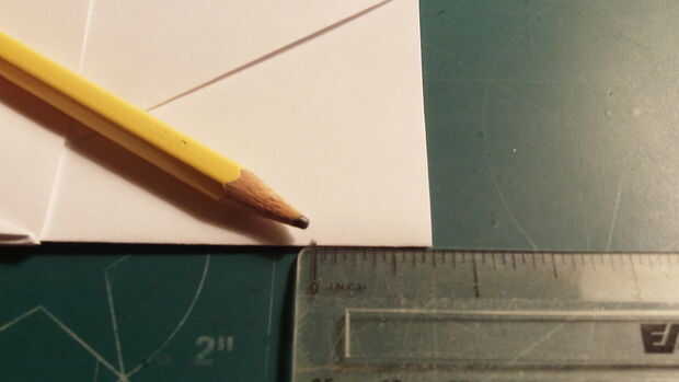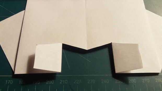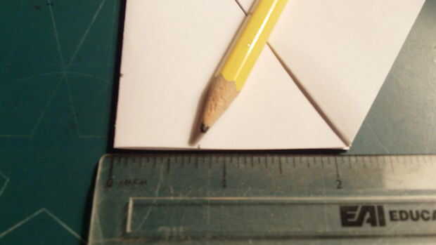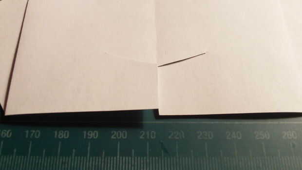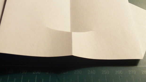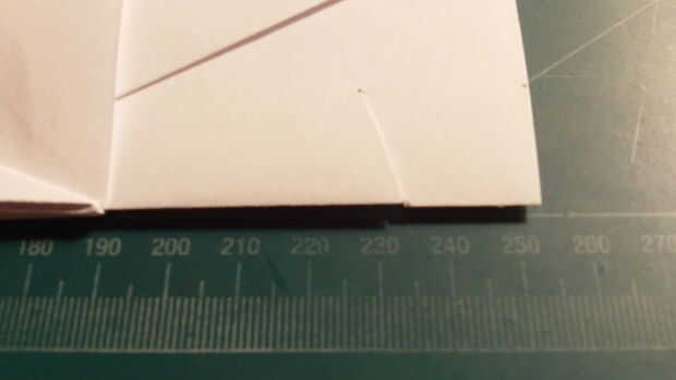 Tire ala extensión pliegues que antes hacia el exterior, con sus traseros se extiende completamente y los bordes de adelantados al ras con la parte posterior de la tapa de la cubierta. Hacerlo en ambos lados y luego plegar el aeroplano en la mitad a lo largo de su pliegue de centro. Hacer marcas de 0,75 pulgadas pliegue hacia adentro desde el borde de fuga a lo largo del centro pliegue y 0,75 pulgadas hacia afuera desde el centro a lo largo del borde posterior. De la marca a lo largo del borde posterior, mide 1 pulgada hacia adentro y haga una marca. Corte entre la marca en la línea central y la marca de 1 pulgada en de la marca de borde de fuga. Ahora abre el aeroplano y corte entre los bordes de fuga y la línea de corte de aleta. Doblar las aletas mientras que asegurándose de que siguen siendo paralelas a la línea de centro (puede hacerlo alineando sus bordes de fuga con los del ala).
