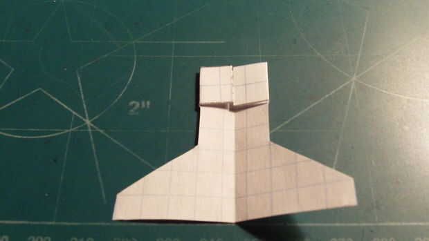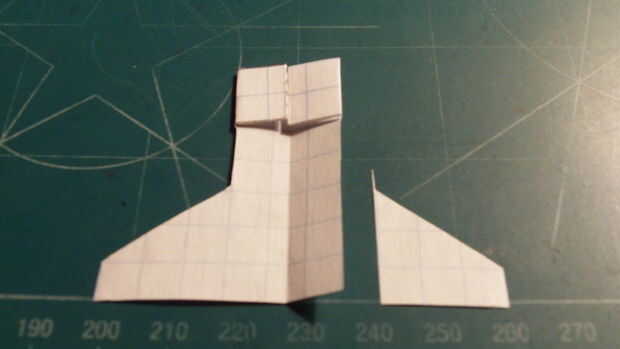 Begin cutting out the fuselage. Luego doblar por la línea punteada. Empezar a hacer su timón mediante la separación del estabilizador vertical. Luego, corte una de las dos capas de papel donde el timón debe estar apagado (generalmente interrumpe el derecho mismo). Después ha cortado estas cajas apagado, usted puede deshacerse de ellos. Después de haber doblado las líneas correctamente, debe cortar a lo largo de la línea en medio del fuselaje. Hacerlo doblando el fuselaje a la derecha, hacer un corte y repetir el doble a la izquierda. Luego únalos con cinta adhesiva el fuselaje en el frente, hacia atrás (contra el estabilizador vertical) y en el pliegue de contrapeso.
