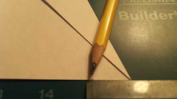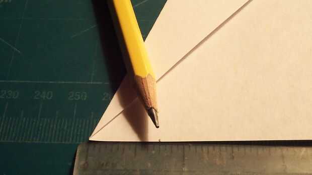 El avión del doblez por la mitad a lo largo de su doblez de centro. Una vez hecho esto, doblar los canards abajo, alineando sus bordes de ataque con el de la nariz para mantener el ángulo de incidencia. Después de esto, medir 0,75 pulgadas sobre el pliegue de centro en el borde posterior de la armadura de avión. Doble las alas hacia abajo en esta marca (mantiene el ángulo de incidencia, alineando los bordes de fuga de las alas con el fuselaje). Mide 0,75 pulgadas desde el extremo del ala a lo largo de los bordes de fuga, y las aletillas.