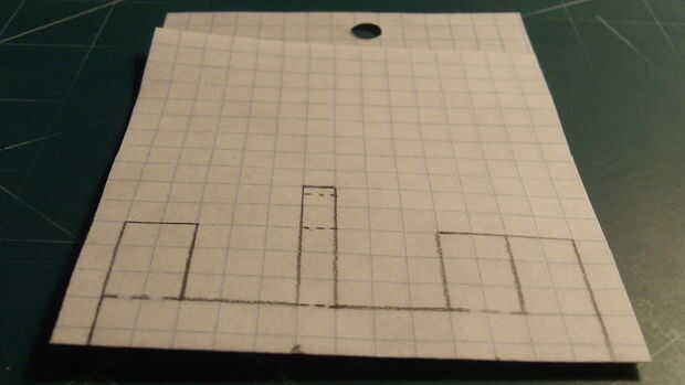 En primer lugar, comenzar por plegamiento eres tu papel milimetrado en la mitad (excepto tres cajas en el lado perforado). Una vez que el papel ha sido doblado adecuadamente, haga dos marcas--13 cajas full apart. Use una regla para hacer una línea recta con una longitud de 13 cajas directamente a 1 fila de cajas de las dos marcas que acaba de hacer. Luego realizar los elevadores, timón, largueros, tren de aterrizaje y contrapeso como se indica. Siga las marcas de la fotografía. Una vez que todo está marcado hacia fuera, cortar el fuselaje.