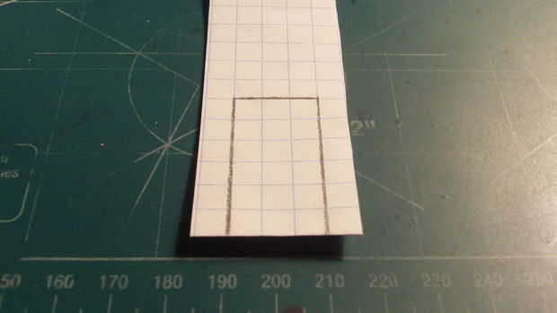 Después de que el fuselaje se hace, tomar otra hoja de papel que se dobla por la mitad a lo largo de las líneas de cajas. Marcar el ala como se muestra (3 cajas de largo) y 6 de ancho.