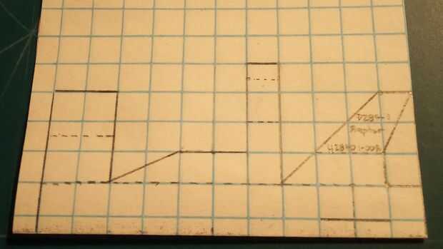 Una vez que el fuselaje ha sido trazado, comenzar marcando las alas y el estabilizador horizontal. Borde de ataque del estabilizador horizontal debe tener un barrido que por cada 2 cajas de la raíz, una caja de cuerda decae. El borde de fuga debe decaer una fila de cajas de acorde cada tres cajas. Para el ala, hacer dos marcas cuatro cajas aparte. El acorde debe decaimiento caja dos cada tres cajas de la primera casilla de la raíz. El borde posterior debe tener un decaimiento del acorde del 1 cuadro de cada 3 cajas de luz más allá de la primera. Una vez que ha marcado cada una de estas superficies hacia fuera, usted puede cortar hacia fuera.