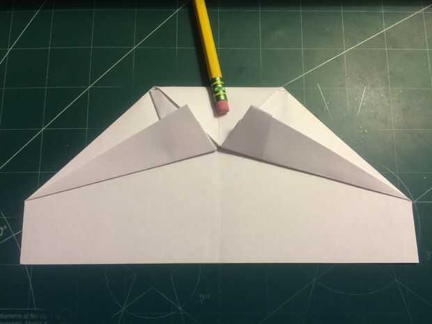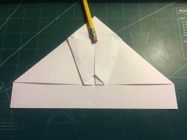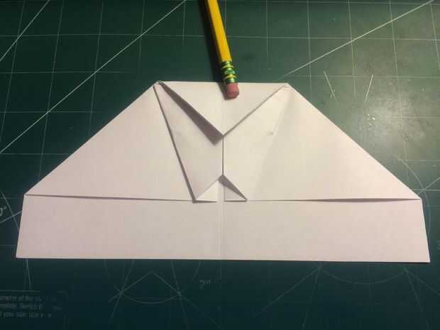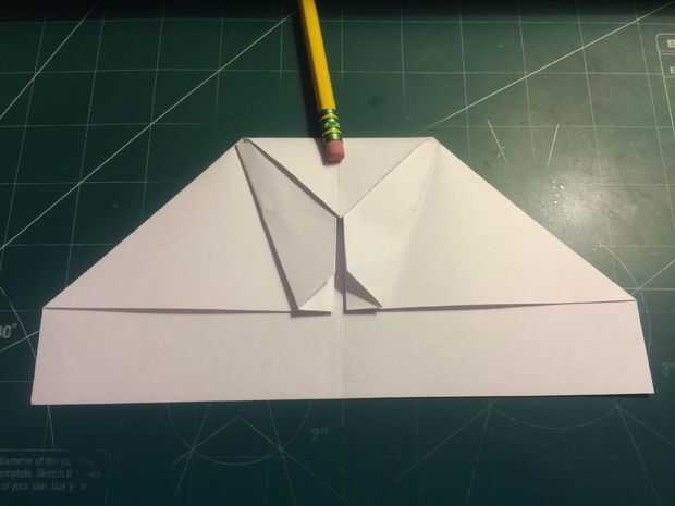 Tire de los bordes diagonales que se arrastra de los pliegues de la sobreposición de cada lado en el centro. Después de hacer esto, tirar hacia atrás la punta del triángulo de la nariz hacia adelante a los límites impuestos por pliegues primera de este paso. Meta los bordes delanteros de los dobleces primera en la sección de triángulo como muestra la imagen. Una vez hecho esto, tire de las secciones de la superficie de sustentación no hacia adelante como se muestra y pliegue. Después de hacer el pliegue, revertir el doblez y métalos por debajo de las superficies de sustentación.