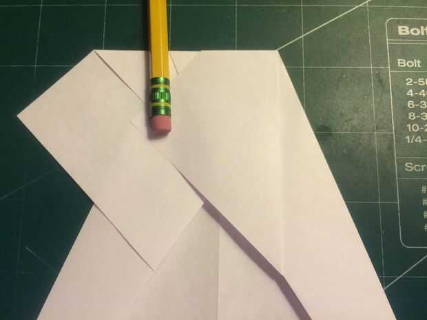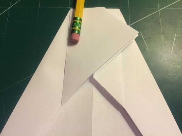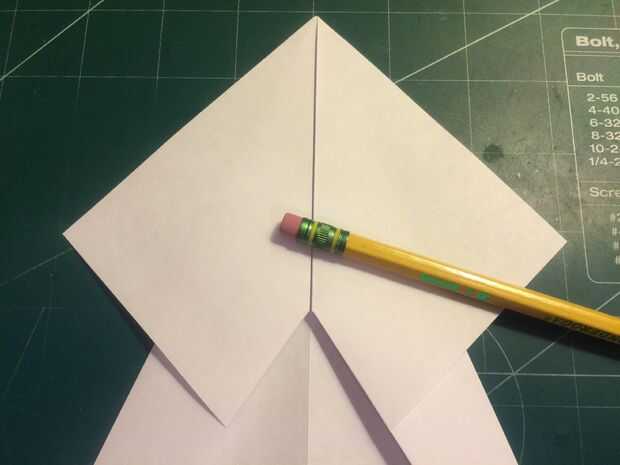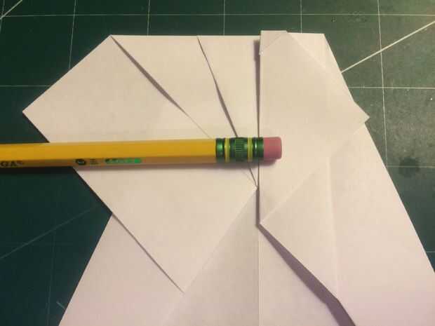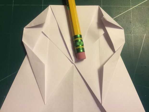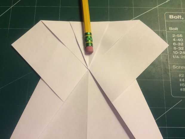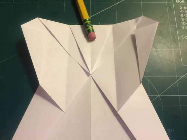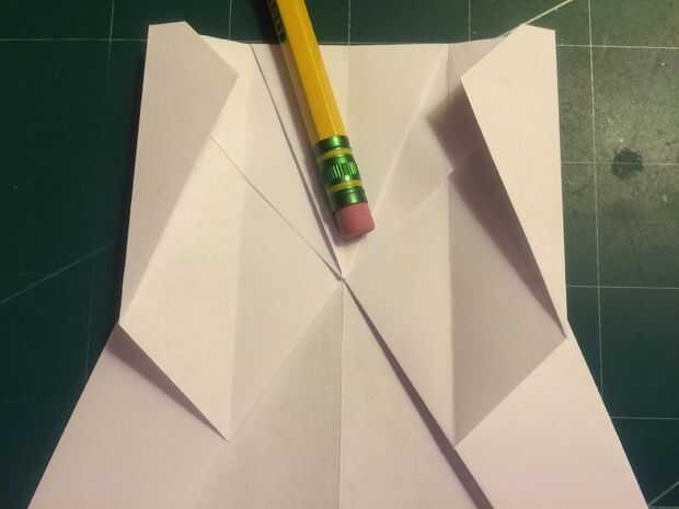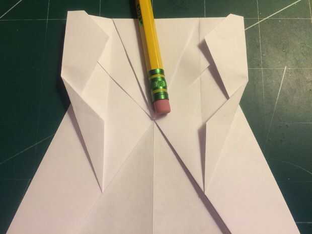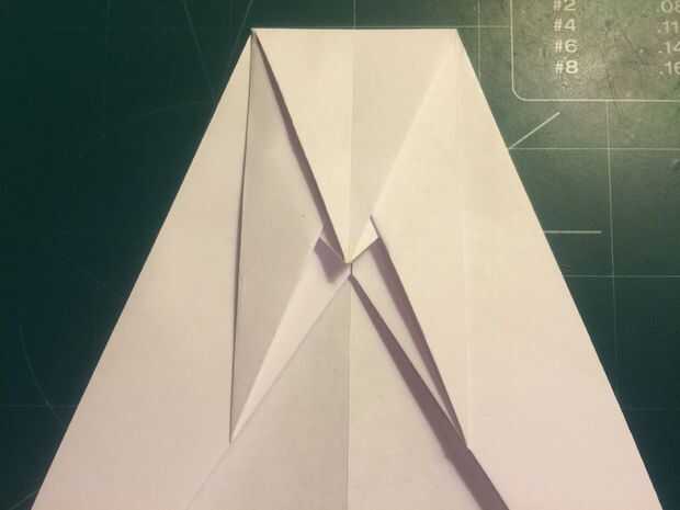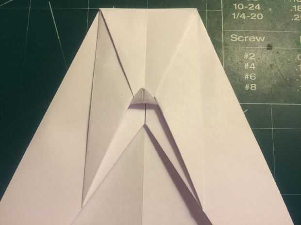 Desplegar la nariz, luego doblar los bordes de fuga del interior tercer externo en cada lado. Después de hacer esto, restaurar el primer doblez del paso y doble el tercio externo sobre la parte superior del tercio medio.