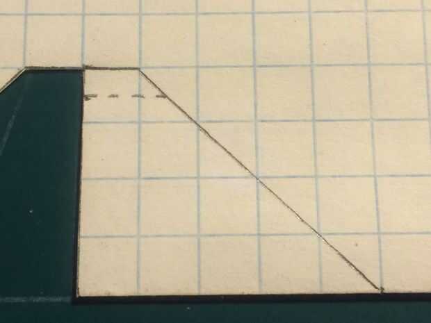 Después de que el fuselaje se hace, tomar otra hoja de papel que se dobla por la mitad a lo largo de las líneas de cajas. Marcar el ala como se muestra (cajas de 1 de longitud por 8 cajas de ancho y una porción barrida frente a este cuadro de 1 caja eliminaron cada caja hacia la parte delantera del fuselaje). Hacer una línea punteada paralela a la línea de doblez de centro medio un cuadro en de la punta del ala. Luego cortar el ala.