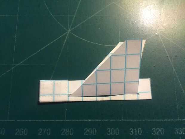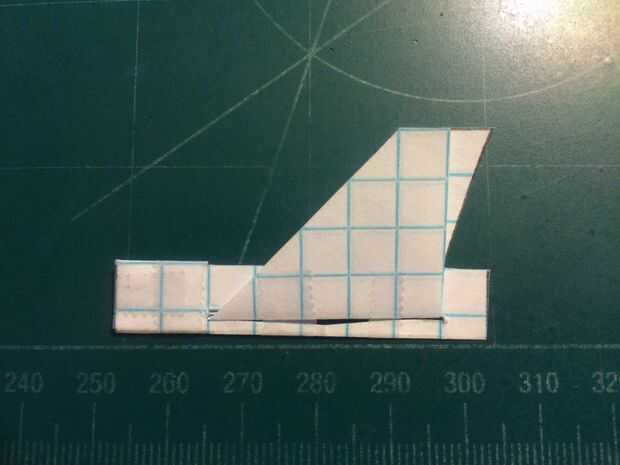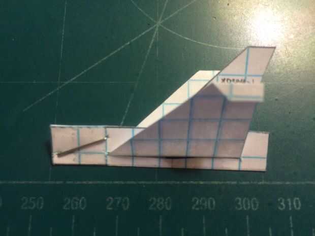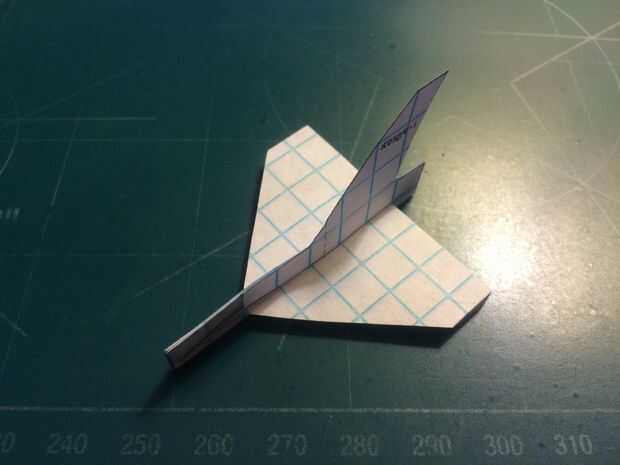 Cortar las alas, tirar del ala a través de la fisura en el fuselaje y entonces aplique cinta. Doblar las aletillas por la línea punteada. Aplane las alas y canards para donde no tienen ninguna desviación anhedral. Aplicar una grapa en la zona de los pliegues de contrapeso. Esto completará tu DeltaRay.