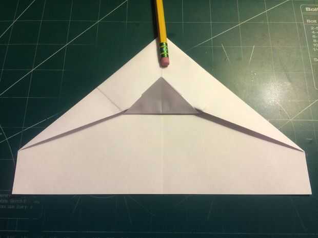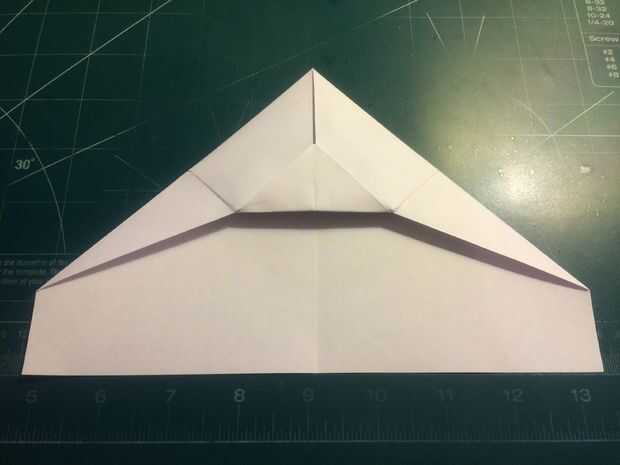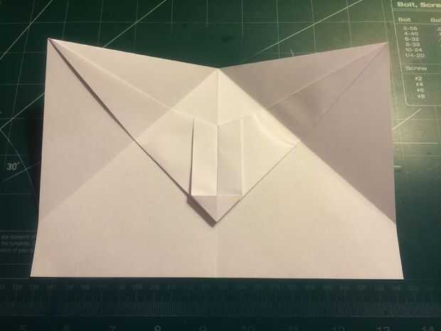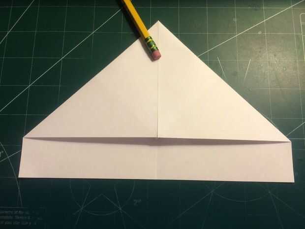 Doblar el borde del papel en el pliegue de centro como se muestra, pliegue y despliegue. Doblar los bordes en los pliegues y luego restaurar el primer conjunto de pliegues. Doblar el triángulo al descubierto en la parte de atrás hacia adelante hasta que usted no hale hacia delante ninguna más. Después de hacer esto, coloque los perfiles en los pliegues internos del triángulo.