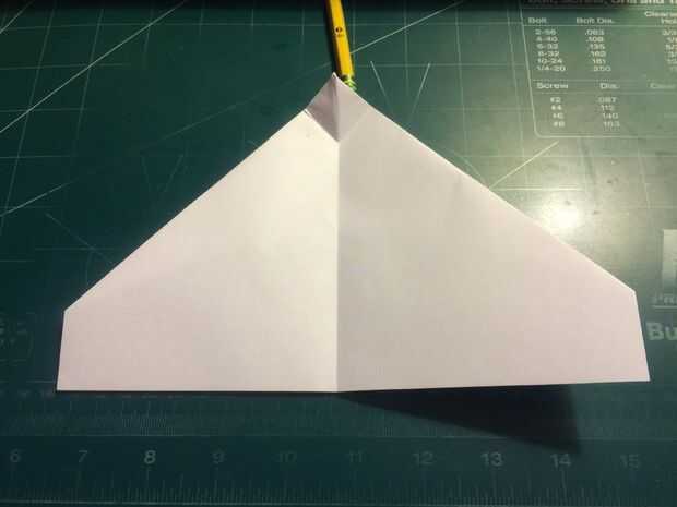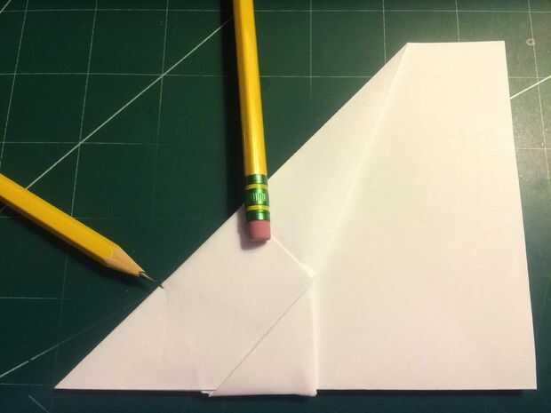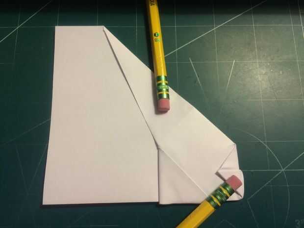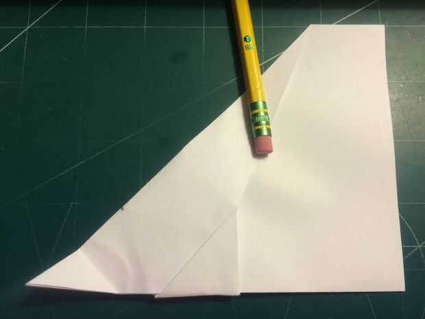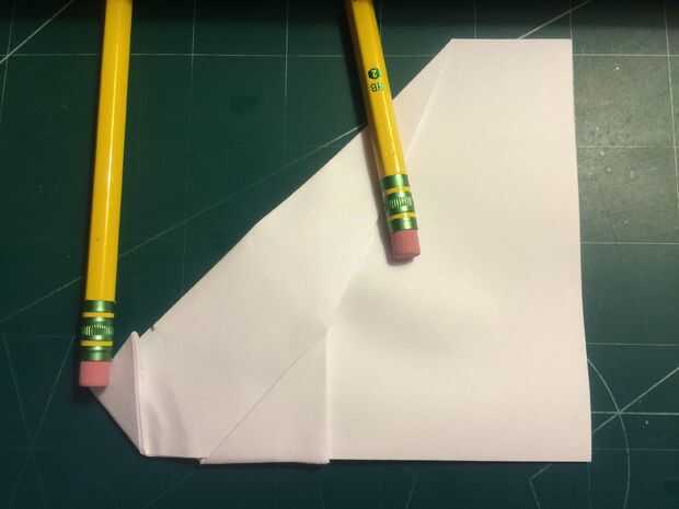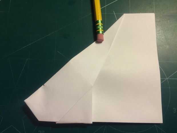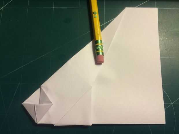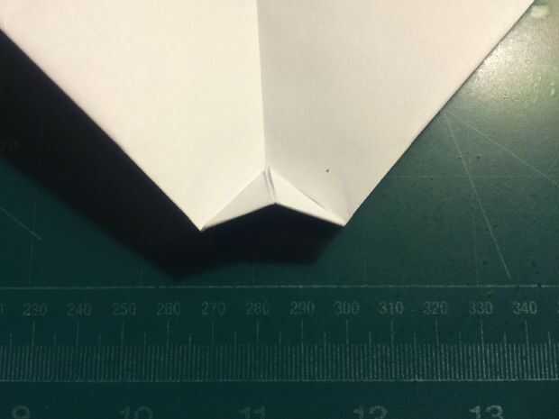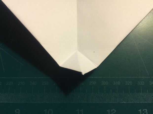 Encontrar el borde delantero del ala interna de pliegues de la estructura en el papel y tire la punta de la nariz de nuevo a este punto como se muestra. Hacer un pliegue cuando lo han hecho y revelar la nariz y luego diseño el plano de papel. Invierta los pliegues para que permita esta nueva sección de diamante pueda ser movida entre los dos lados del papel cuando se dobla. Después de hacer esto, tire de los nuevos puntos de la nariz hacia atrás a cada lado como muestra la imagen.
