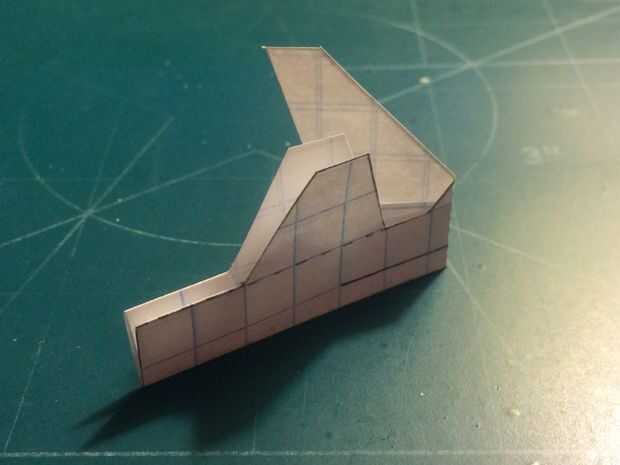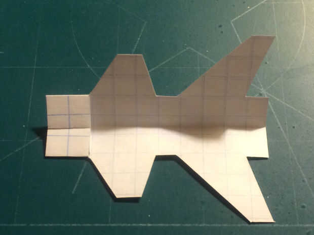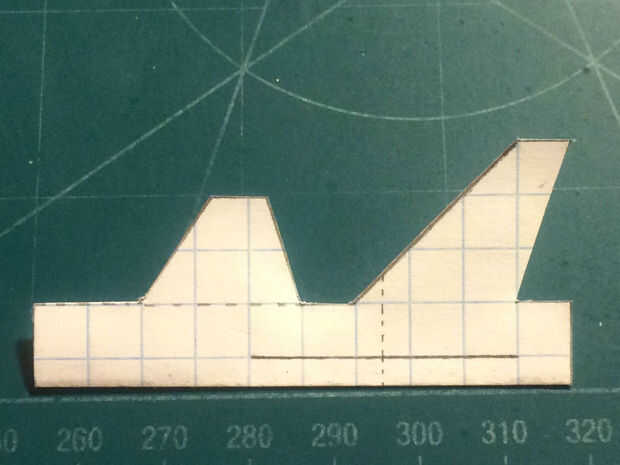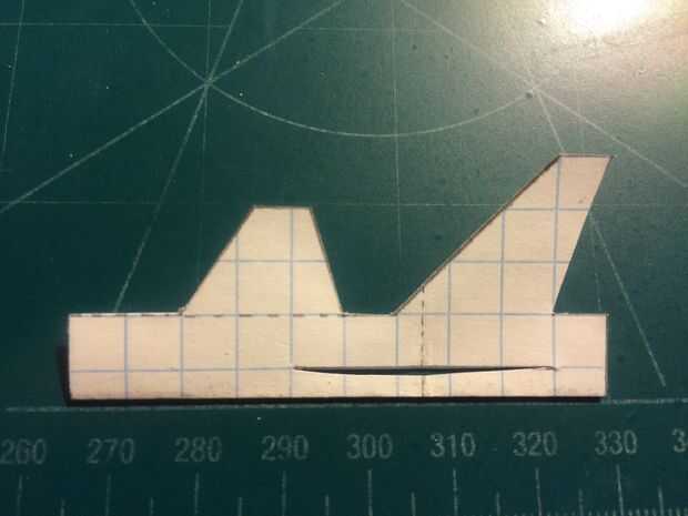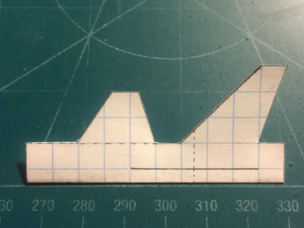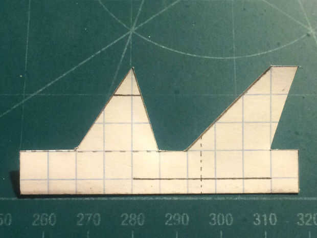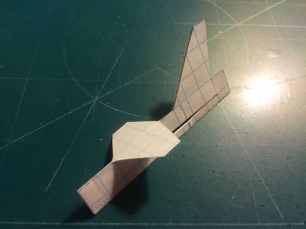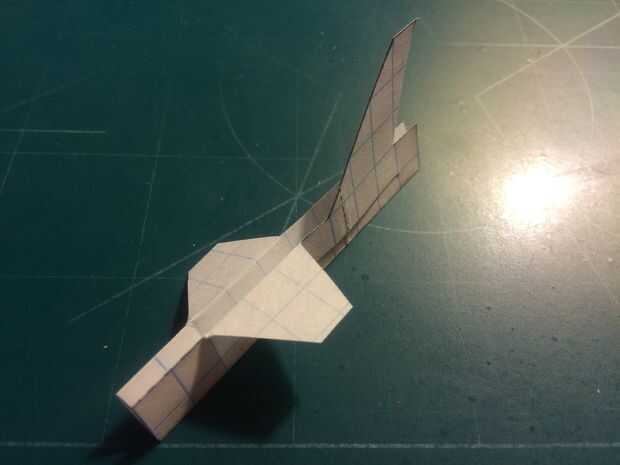 Cortar el fuselaje y doblar sus contrapesos en su lugar. Corte la aleta vertical extra. Una vez hecho esto, doblar a lo largo de la línea de puntos vertical y corte a lo largo de la línea horizontal continua. Una vez realizado el corte, suelte el pliegue. Doble hacia abajo las canards y cinta de designado.