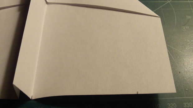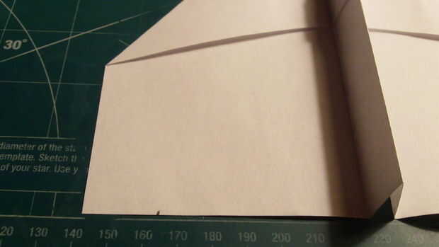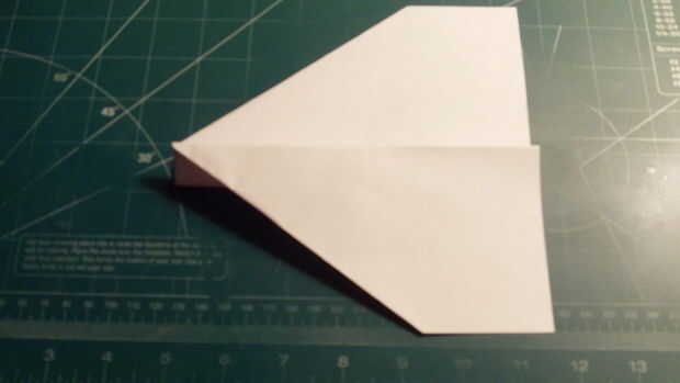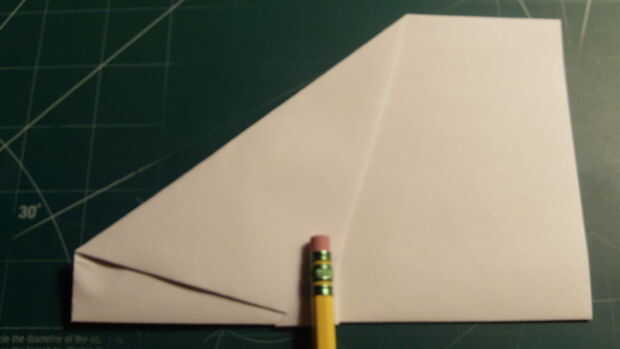 Fold your airplane up in half. Luego, con su regla y lápiz, marque puntos 7/8 de pulgada hacia fuera desde el pliegue de centro y de los extremos del ala en el borde de fuga. Doble las alas hacia abajo a lo largo de esta marca, manteniendo el ángulo de incidencia a 0 grados, alineando el borde de fuga del ala con el fuselaje. Una vez que cada ala se dobla, dobla las aletillas hacia adentro a lo largo de sus marcas. Mantenga las aletillas paralelo con el fuselaje doblando los bordes de fuga están alineados con el de la ala.