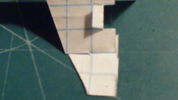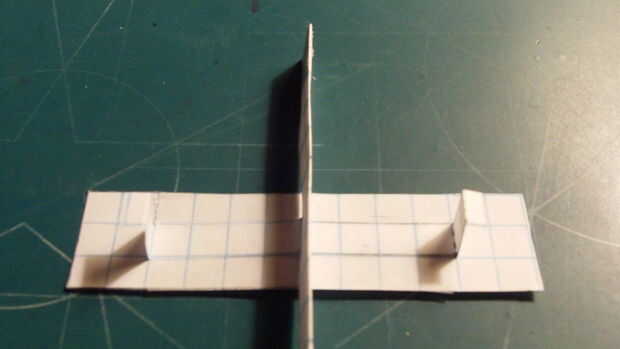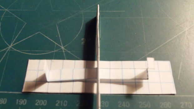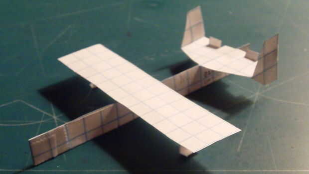 Ahora es el momento para trabajar con el ala de los Géminis. Corte sus alas y desplegarlo. Su fuselaje invertido del tirón y aplique la cinta a los largueros. Entonces Únete a ala y el fuselaje en los largueros. Corte los estabilizadores verticales y luego desarrollan ellos y corte que les fueron dirigidas. Debajo de cada una de las plazas en los estabilizadores horizontales, alinee los estabilizadores verticales. Luego con cinta adhesiva como se muestra. Colgante cinta hacia la parte posterior de la aleta se debe envolver alrededor del lado externo, pero a la vanguardia, tal proyección no es necesario. Una vez ambas aletas, se aplican dos grapas (1 en cada lado) a las aeronaves en la zona del contrapeso.
