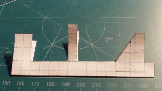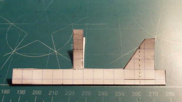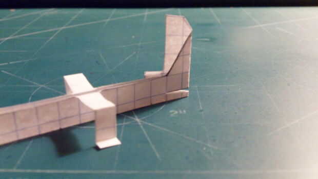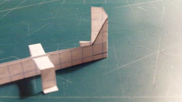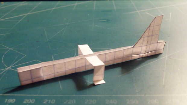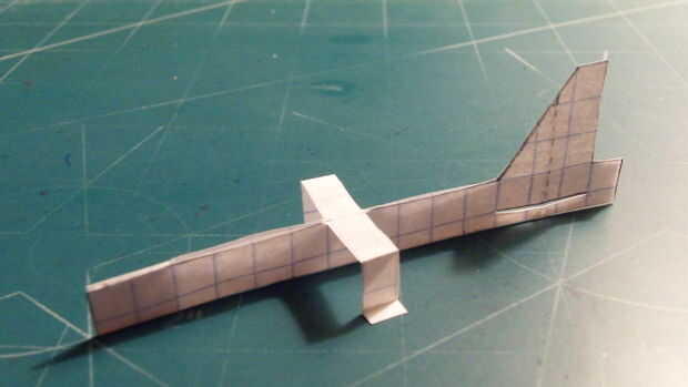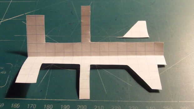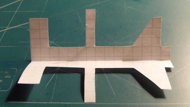 Para comenzar a trabajar en su Hornet Strike, córtelo hacia fuera. Luego corte uno de los dos timones. Continúe plegar por la línea punteada. Al llegar al timón, doble a lo largo de la línea vertical punteada y cortar a lo largo de la línea horizontal continua. Una vez que se este redil, cinta en los puntos designados.