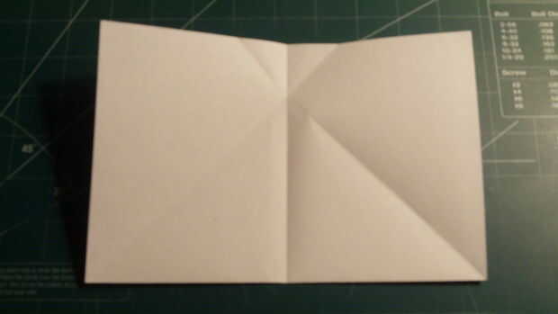 Se trata de cómo hacer el avión de papel más rápido que he visto. Llaman el águila.Paso 1: Doblar por la mitad Este es un paso fácil. Sólo doblar una hoja de 8,5 x 11" de papel en medio abajo el centro como en la foto y luego abrirlo para arriba otra