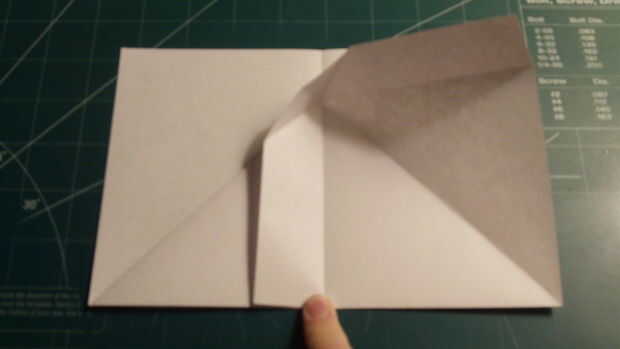 Ahora que todos los pliegues que necesita están en su lugar, dobla el papel por sobre sí mismo para hacer la cubierta doble como se muestra. Tire de ambos lados y luego el papel sobrante se superponen y hacen una más pequeña sección rectangular con un frente triangular.