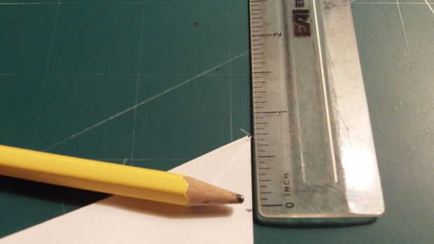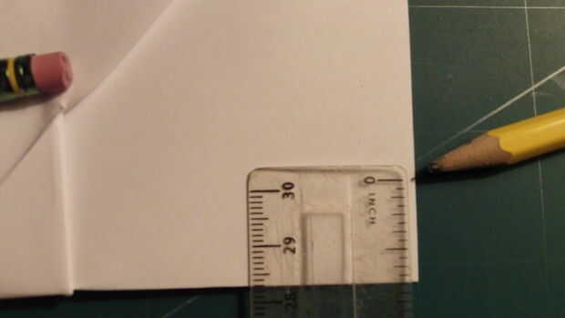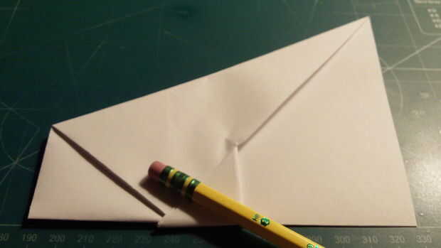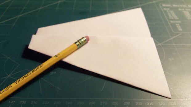 Su avión del doblez por la mitad a lo largo de su longitud como se muestra. Medida 0,75 pulgadas hacia fuera de la longitud doble pliegue y haga una marca. Mide 0,75 pulgadas hacia el interior de la punta del ala y hacer una marca. Doble las alas hacia abajo en la marca que hiciste anteriormente. Alinee el borde de fuga del ala con el fuselaje. Repita en el otro lado. Una vez que ambas alas se pliegan, voltear el avión invertido y agarrar las puntas de sus alas. Doblarlas en las marcas realizadas anteriormente. Alinee los bordes de fuga de aletillas con aquellos del ala.