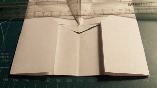 Doblez los extremos del ala hasta los pliegues de la ingesta. Plegar el aeroplano a lo largo de su centro otra vez, pero revelan los extremos del ala. Con tu regla, mida 3/4 de pulgada hacia adelante del borde de fuga. Ponga una marca de aquí. Luego se mide en el ala cerca de 7/8 de pulgada, en unos 25 grados de la marca anterior. Ponga una marca allí también y después corte de la marca en el extremo del ala al interior. Esto habrá creado su aletas.