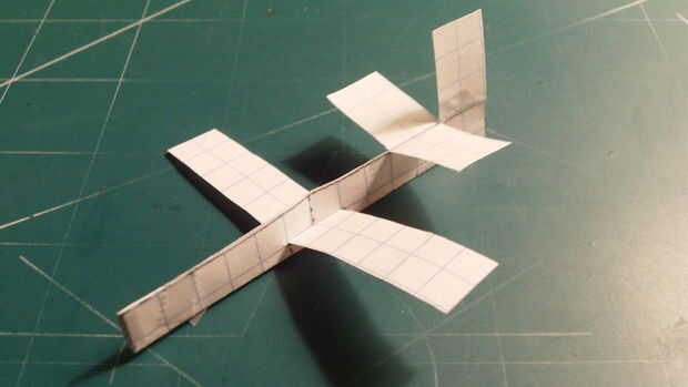 Ahora es el momento para trabajar con el ala de su Jayhawk. Separar el fuselaje por el corte que hiciste. Después el ala a través del fuselage y tire de la mitad de él a través. Luego doblar las dos mitades a cada lado del fuselaje. Luego aplique un pequeño trozo de cinta en la parte inferior de las alas mientras que se doblan para arriba a ras con el fuselaje.