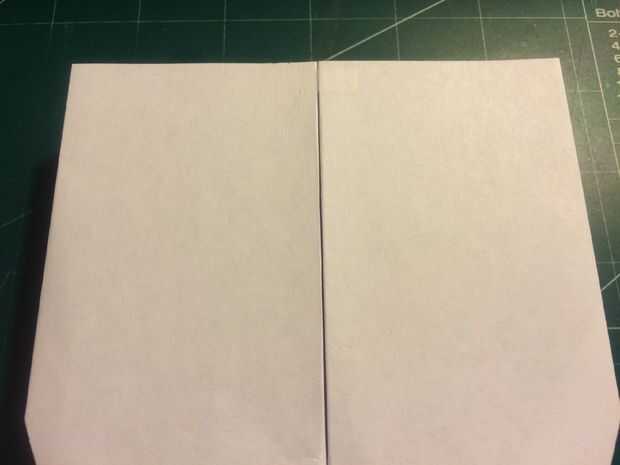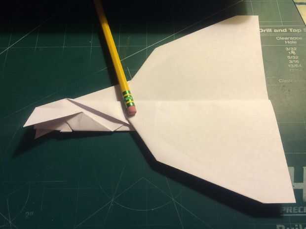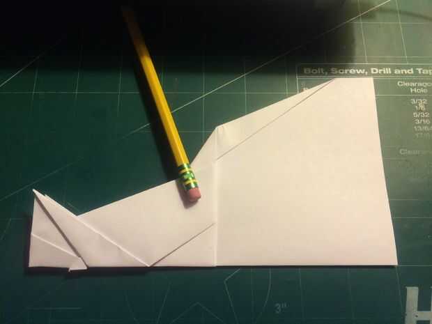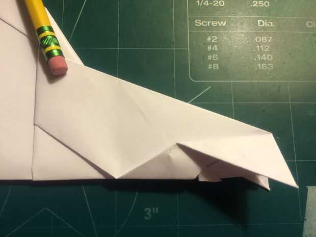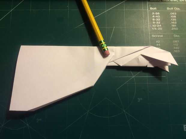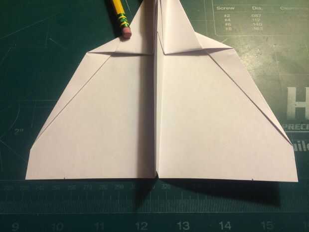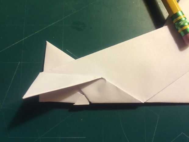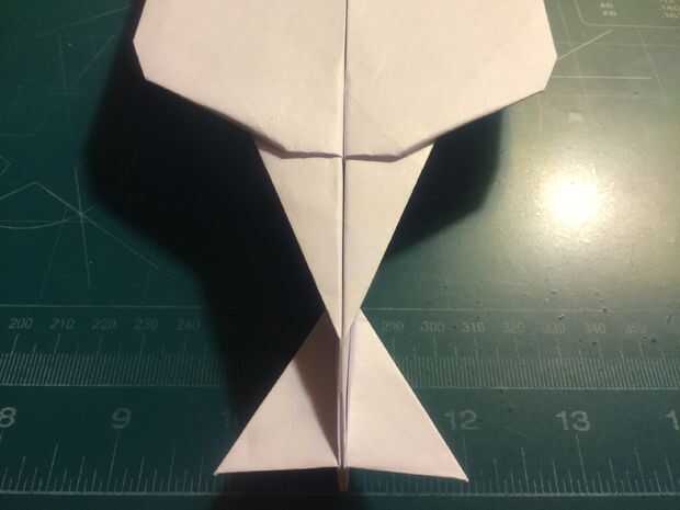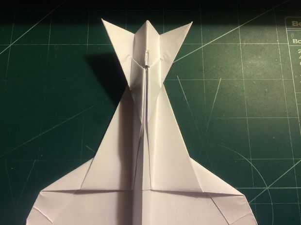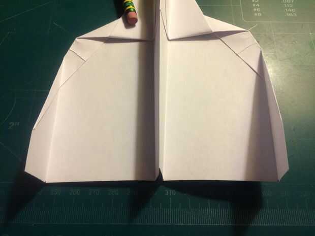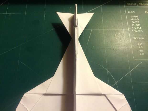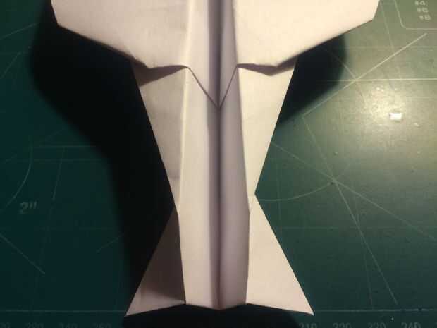 Doble su avión de papel por la mitad a lo largo de su centro. Doble los canards hacia abajo como se muestra, alineando su borde de ataque con el fuselage mantenga un ángulo de incidencia de cero grados. Medida 1 pulgada hacia arriba a lo largo del borde posterior desde el pliegue de centro y 1 pulgada hacia adentro de la punta del ala a lo largo del borde posterior. Una vez hecho esto, pliegue las alas hacia abajo en la marca de 1 pulgada que hiciste anteriormente. Después de esto se ha completado, doblar cada aletilla en el punto de 1 pulgada que hiciste anteriormente. Después de las aletillas, aplique cinta de designado. Esto completará tu JetVulcan.