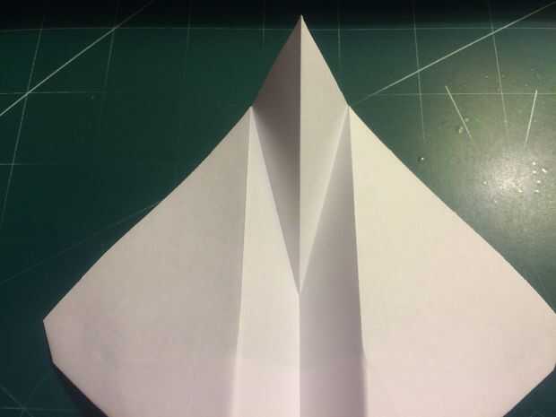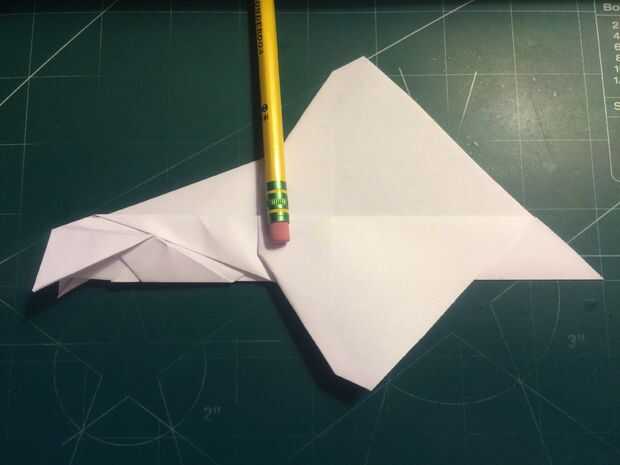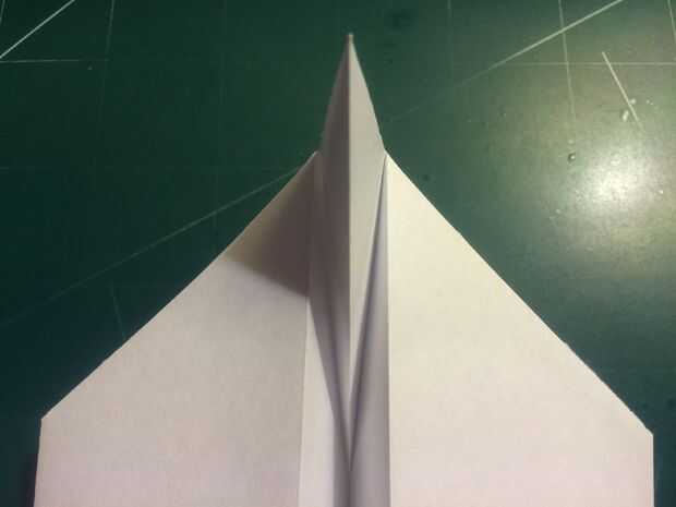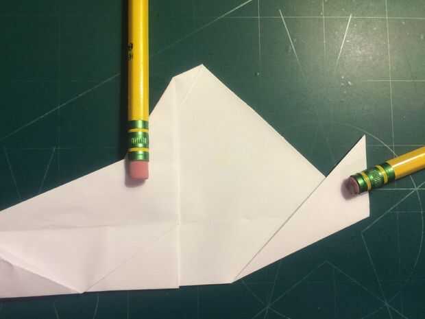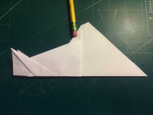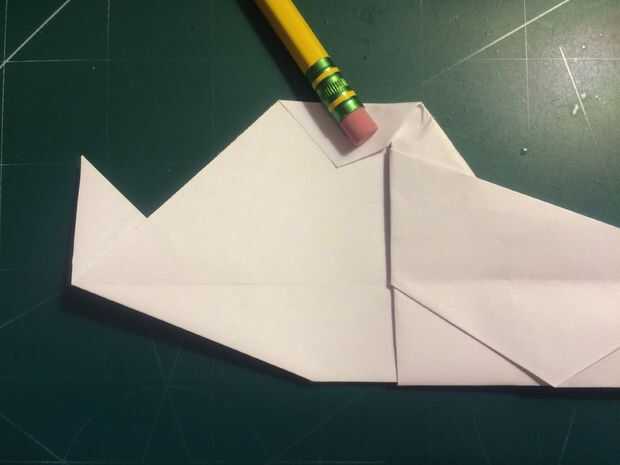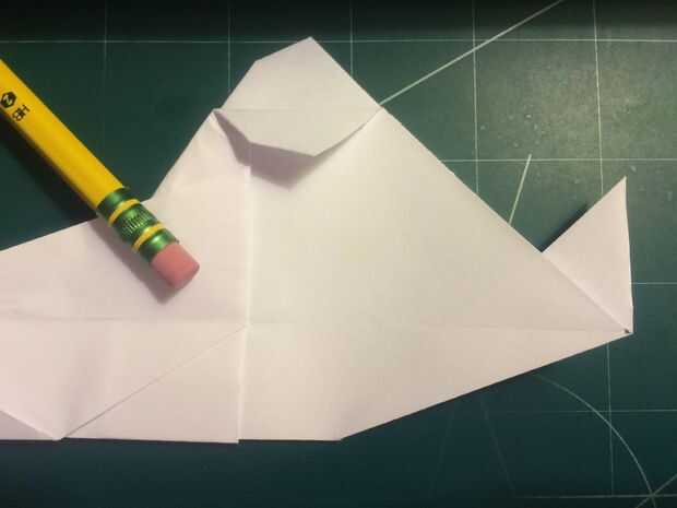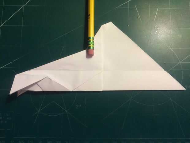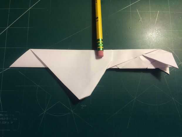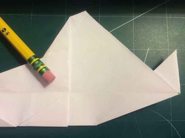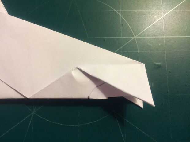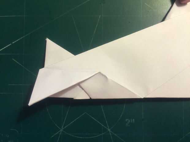 Con la cola en su lugar, plegar las alas hacia arriba otra vez y doble los extremos hacia abajo. Los bordes de la superficie de sustentación son su referencia; dobla el papel para que el borde exterior del borde de fuga de superficie de sustentación se sienta sobre su parte más interior como se muestra en las fotografías 11 y 12 y repita del otro lado.