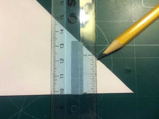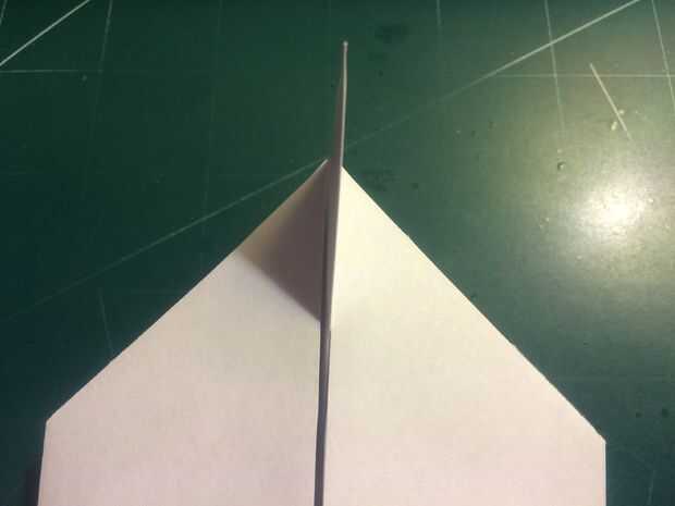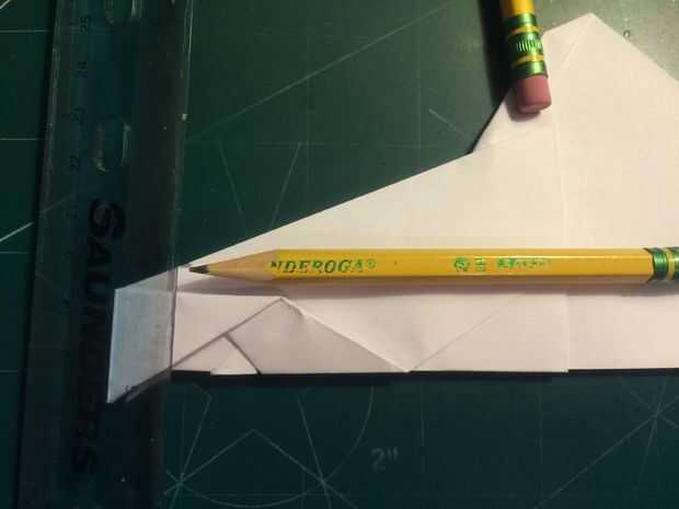 Doble hacia abajo las canards mientras mantienen sus bordes principales alineados con la nariz para mantener un ángulo de incidencia de cero grados. Medir 0,875 pulgadas por encima del pliegue del centro y hacer marcas en esta distancia en la parte delantera y trasera de papel como se muestra. Conectar estas dos marcas con un pliegue a cada lado para crear las alas.