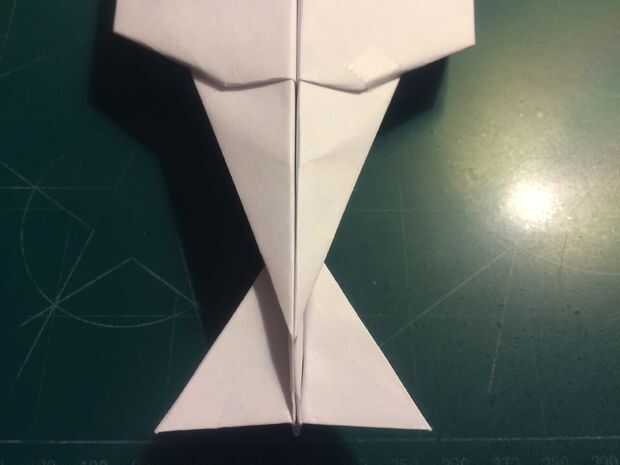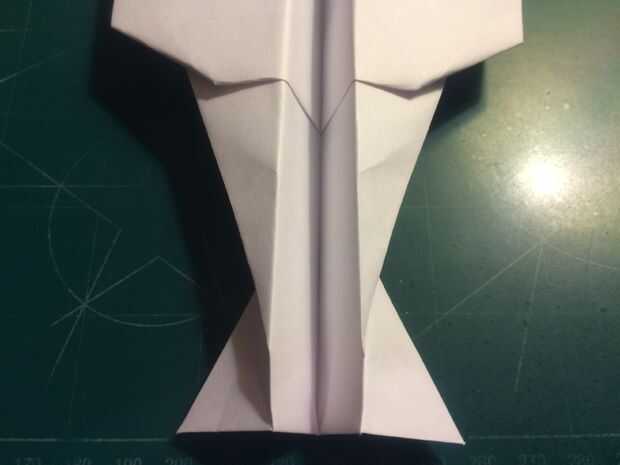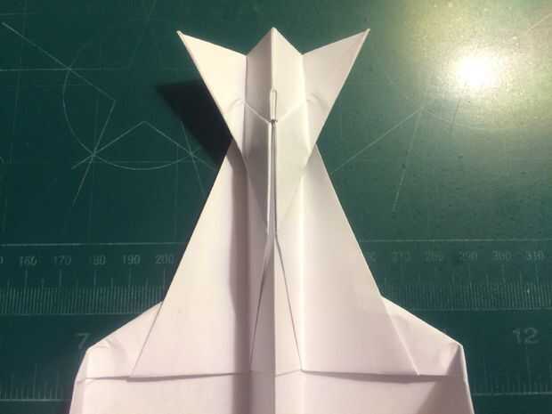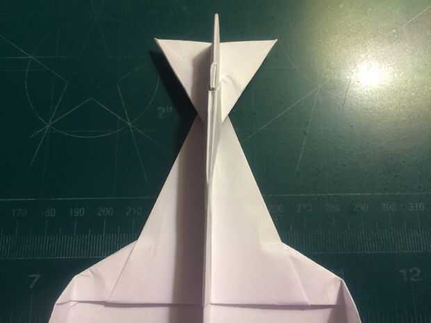 Después de hacer los pliegues de la ala, doble del fuselage posterior hacia arriba para que su borde posterior forma un ángulo perpendicular a los pliegues de la raíz de ala por el paso anterior. Después de doblar y arrugar la cola, revertir los pliegues y tire el papel a través de como se muestra en la fotografía 10.
