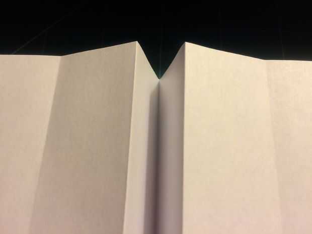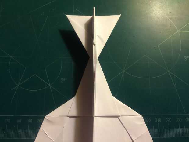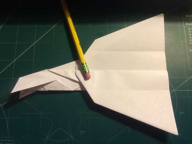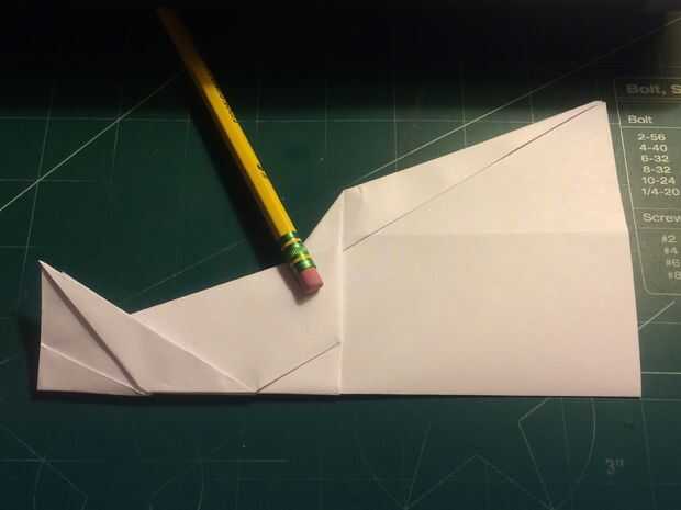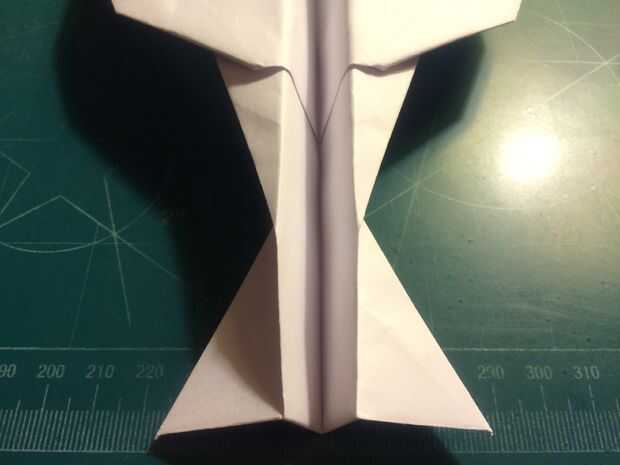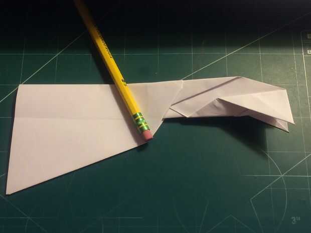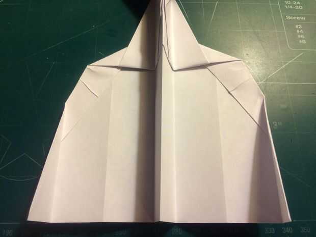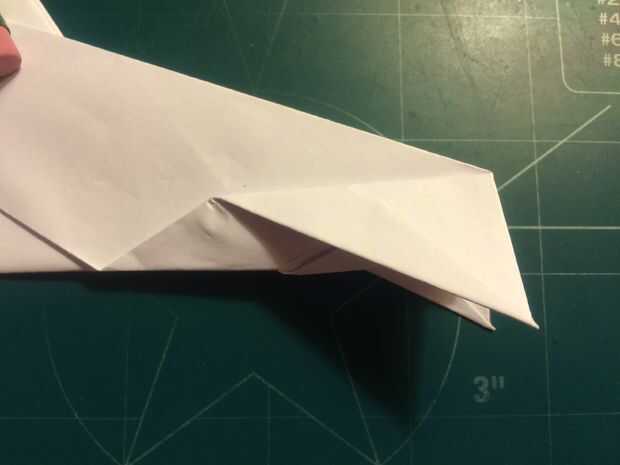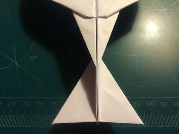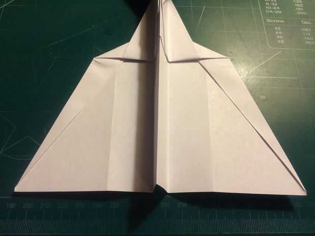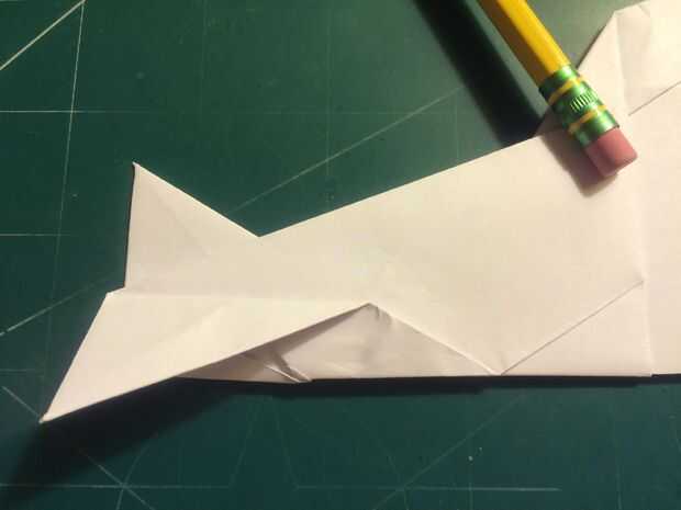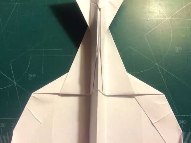 Doble hacia abajo las canards mientras mantienen sus bordes principales alineados con la nariz para mantener un ángulo de incidencia de cero grados. A continuación, plegar las alas en el cuarto pliegues que previamente. Alinee los bordes de fuga de las alas con eso del fuselaje para mantener el ángulo de incidencia a cero grados. Después de que esto termine, doblar los extremos del ala hasta los pliegues cuarto.