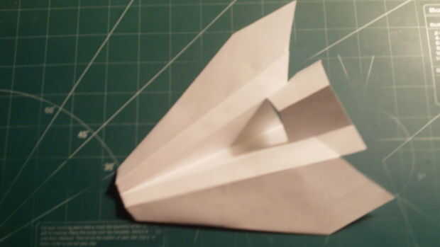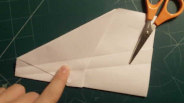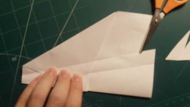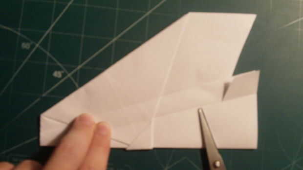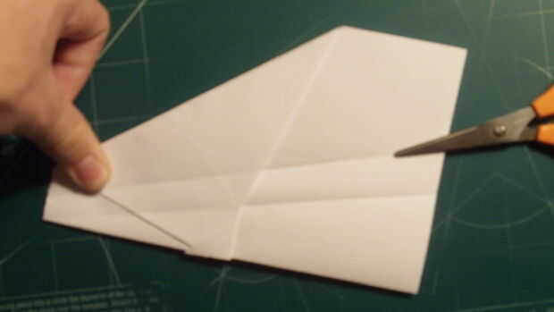 Para hacer los estabilizadores ventrales, corte 1/2 de pulgada en el papel a lo largo de la parte superior (furtherest de la línea de centro) doblez del ala y luego baja a la raíz del ala abajo en un ángulo de ~ 65 grados. Luego desde el borde posterior del ala, satisfacer ese ángulo y corte el borde de fuga. Luego cortar la cola desde el centro y tire hacia arriba sobre las alas.