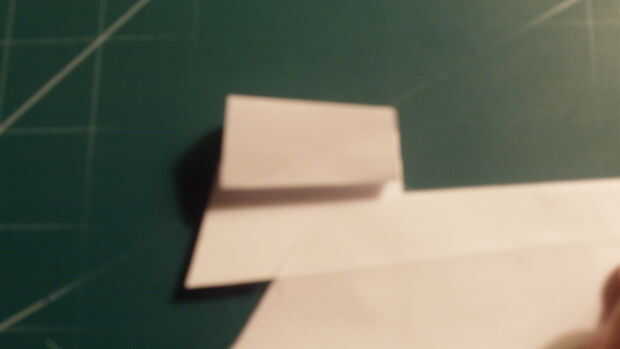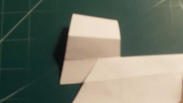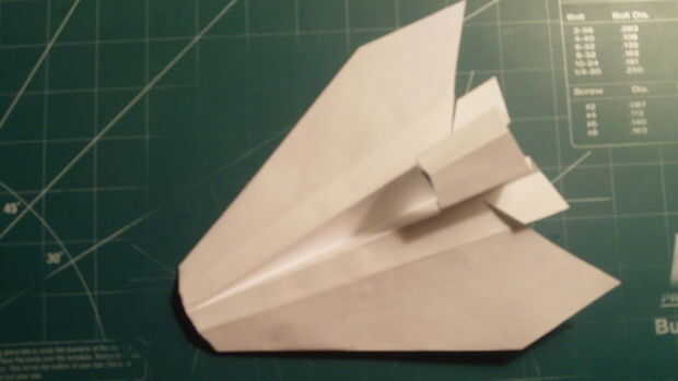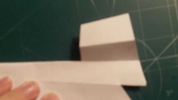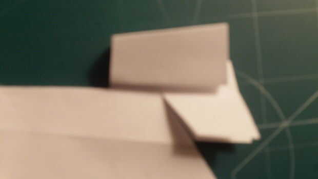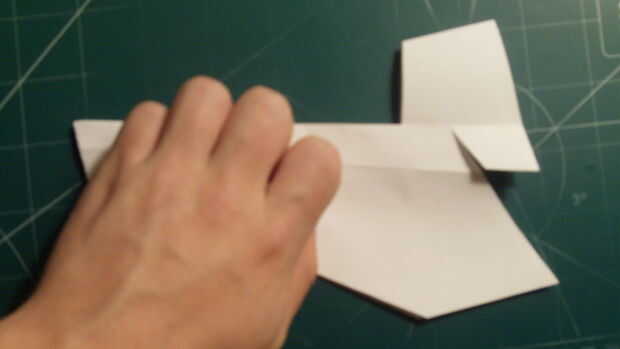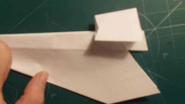 Como el avión se encuentra plano, empujar el pliegue de centro superior de la aleta al centro de las alas. Luego abrirlo como lo era antes. Luego doblar esa línea de doblez de centro hasta la raíz del ala como se cita en el cuadro (Asegúrese de no doblar el otro lado en el proceso). Luego abrirlo. Repita en el otro lado.