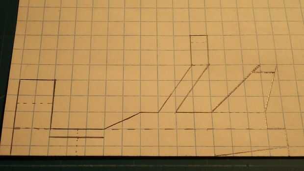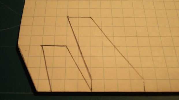 Después de que el fuselaje se hace, tomar otra hoja de papel que se dobla por la mitad a lo largo de las líneas de cajas. Marcar el ala como se muestra (3 por 6 cajas, además de 1 fila de cajas en el pliegue). Más allá de la primera fila, la tasa de decaimiento de acorde a la vanguardia debe ser 2 cajas de acorde cada 3 cajas de luz. Más allá de la primera fila, debe ser la tasa de decaimiento de acorde en el borde de fuga 1 caja cada 3 cajas de luz. Luego marcar los estabilizadores horizontales como 2 por 3, además de una porción barrida con un barrido de 1 caja de acorde que se decae que cada 3 cajas hacia el exterior de la raíz del ala. Para hacer los estabilizadores, medida 3 cajas en la raíz; la tasa de decaimiento de acorde a la vanguardia debe ser 1 caja de acorde cada 2 cajas de luz. La tasa de decaimiento de acorde en el borde de fuga debe ser 1 caja cada 4 cajas de luz. Luego cortar estos.