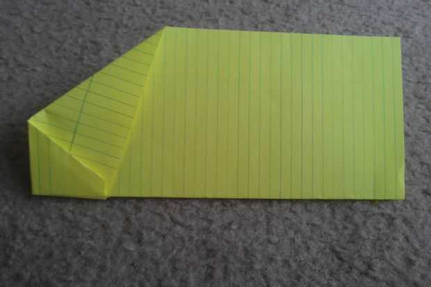 Doblar de nuevo el papel, y luego hacer un básico soy ' doblar como se muestra para crear las alas. A continuación, doblar en la esquina delantera de cada ala para crear un avión en forma de cono.