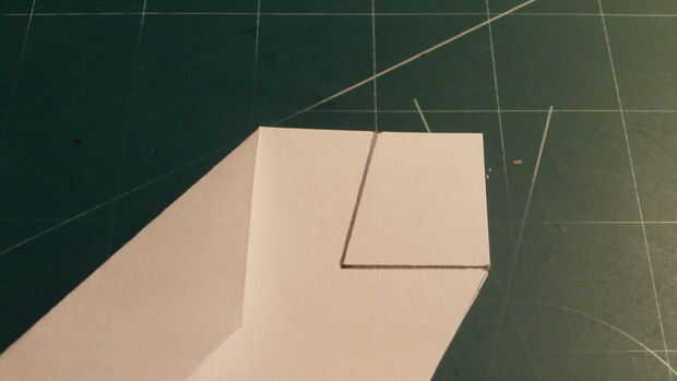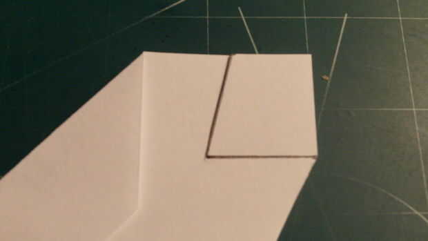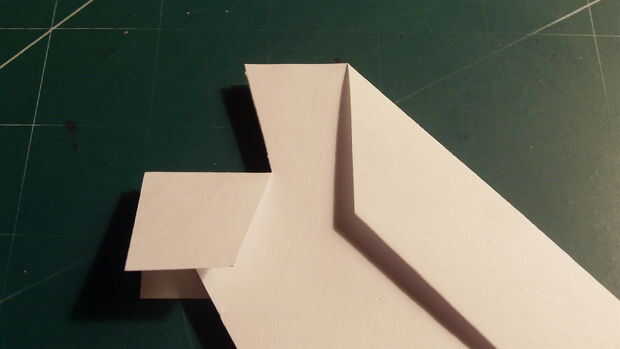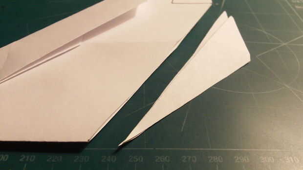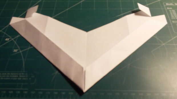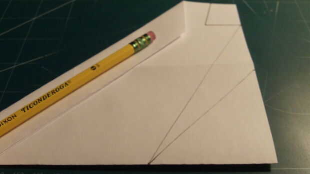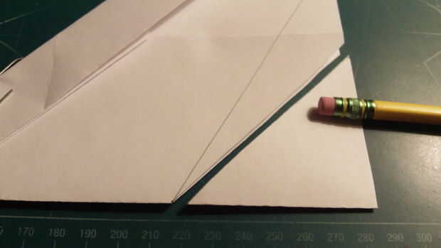 Hacer una línea que conecta a la marca a lo largo del pliegue de centro con marca de la aleta a lo largo del borde posterior. Luego corte a lo largo de la primera línea diagonal que hace y corta el papel pero guardarlo. Luego corte a lo largo de la diagonal solo hechos y eliminar sus desechos. Luego corte a lo largo de la diagonal de las aletas y doblarlas hacia abajo a lo largo de la línea que hiciste anteriormente. Entonces se despliegan el aeroplano a lo largo del pliegue del centro.