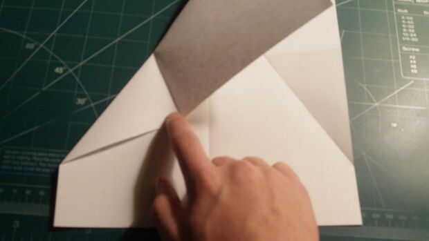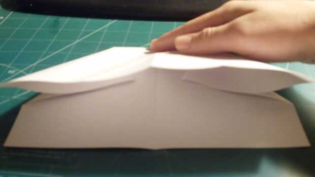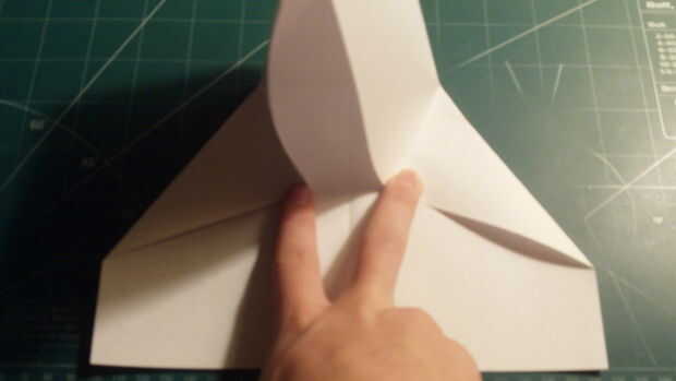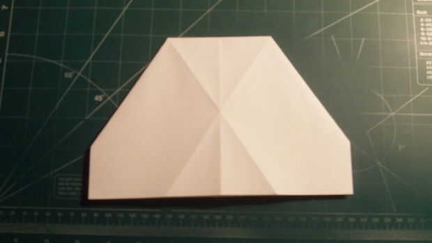 Doble el papel hacia abajo a lo largo del pliegue de la cuarta donde se appearsafter se ha conseguido el doble barrido hacia abajo. Repita en el otro lado. Luego aplanar el papel. Su avión debe aparecer ahora como lo hace en la cuarta foto.