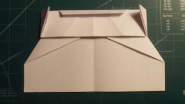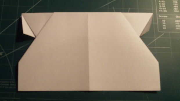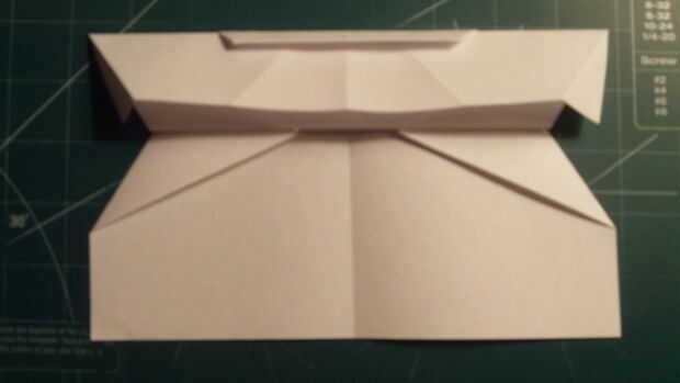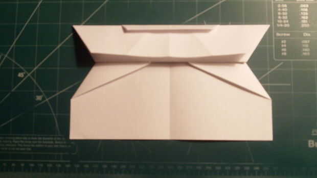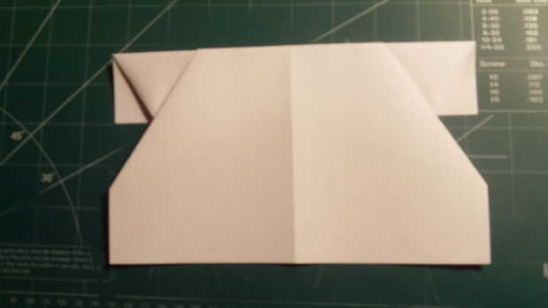 Ahora que tu avión de papel en su parte trasera y está mirando hacia arriba con la parte "limpia". Desde el lado limpio, doblar el borde de los estabilizadores hasta el otro lado. Una vez que ha doblado a ambos lados a lo largo de las costuras y métalos en sí mismos. Después de haber hecho esto, les doblar donde ellos se cruzan con el ala principal, con el frente queda paralelo.