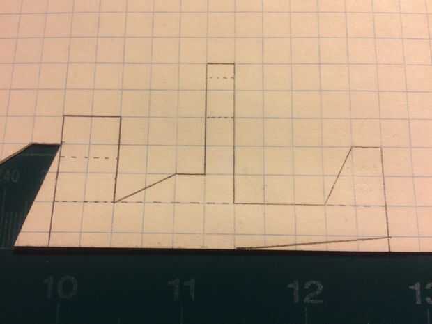 En primer lugar, comenzar por plegamiento eres tu papel milimetrado en la mitad (excepto tres cajas en el lado perforado). Una vez que el papel ha sido doblado adecuadamente, hacer dos marcas--11 cajas completos apart (permite un cuadro más detrás de la armadura de avión). Use una regla para hacer una línea recta con una longitud de 11 cajas directamente a 1 fila de cajas de las dos marcas que acaba de hacer. Luego realizar los estabilizadores, largueros y contrapeso como se indica. La línea diagonal en el fuselaje ventral como se muestra y seguir todas las marcas de la fotografía.
