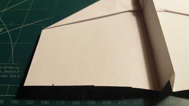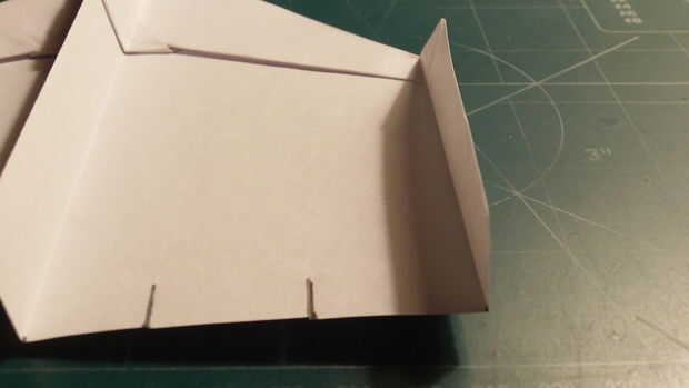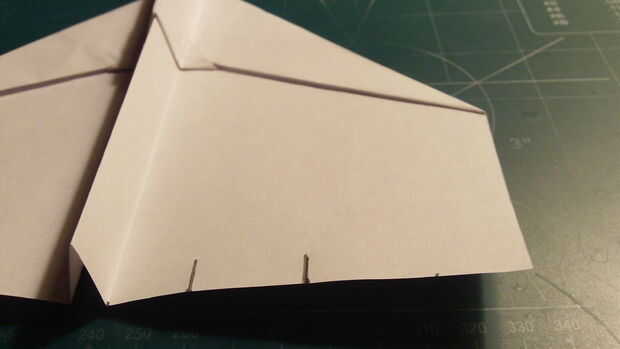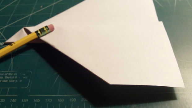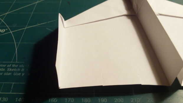 Doble ala de su avión de papel hacia abajo a lo largo de la marca de 0,75 pulgadas en la parte inferior de su fuselaje. Una vez que ambas alas se pliegan hacia abajo, pliegue las aletillas hacia abajo a lo largo de la marca 0,75 pulgadas en la punta del ala.