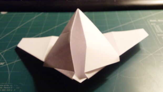 De la orientación anterior, se voltea el avión y abra la nariz como se muestra. Luego aplanar y pliegue el papel, mientras que remeter el borde anterior de la nariz hasta la parte principal de la canard. Una vez que esto haya terminado, baje el ala para que el pliegue cuarto cumple con la parte inferior del fuselaje. Doble los extremos hacia el pliegue del cuarto en el ala como se muestra para las aletillas. Repita en el otro lado.