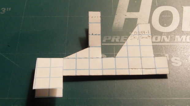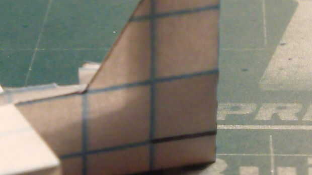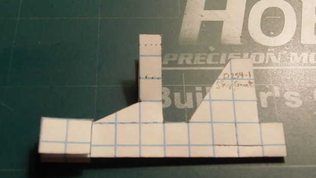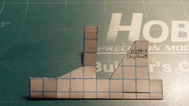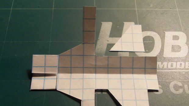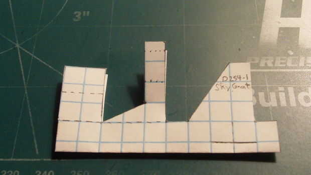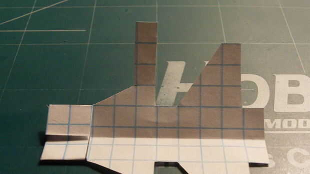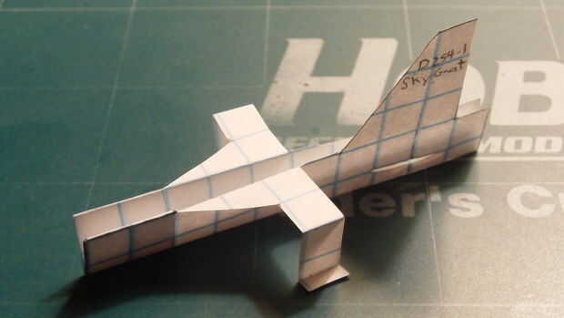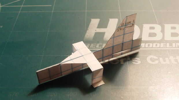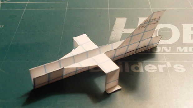 Empezar a hacer el fuselaje de su fuselaje lo cortando y doblando el contrapeso. A continuación, cortar uno de los estabilizadores verticales y plegar el tren de aterrizaje y mástiles. Una vez hecho esto, el estabilizador vertical hacia adelante a lo largo de la línea vertical punteada del doblez y corte a lo largo de la línea horizontal como se muestra. A continuación se despliegan. Una vez este finalizado, cinta de designado.