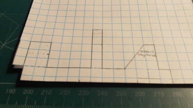 En primer lugar, comenzar por plegamiento eres tu papel milimetrado en la mitad (excepto tres cajas en el lado perforado). Una vez que el papel ha sido doblado adecuadamente, haga dos marcas--13 cajas full apart. Use una regla para hacer una línea recta con una longitud de 13 cajas directamente a 1 fila de cajas de las dos marcas que acaba de hacer. Luego realizar el timón y contrapeso como se indica. Siga las marcas de la fotografía. Luego, marque los largueros de ala y tren de aterrizaje. cajas de 1,5 desde el comienzo de esta línea, hacer una línea de puntos vertical. 1 la caja de la parte posterior, mida 2 casillas hacia adelante y haga una línea sólida larga 2 cajas. Una vez que todo está marcado hacia fuera, cortar el fuselaje.