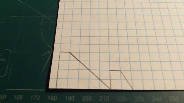 Después de que el fuselaje se hace, tomar otra hoja de papel que se dobla por la mitad a lo largo de las líneas de cajas. Marcar el ala como se muestra (cajas de 1 de longitud por 8 cajas de ancho y una porción barrida frente a este cuadro de 1 caja eliminaron cada caja hacia la parte delantera del fuselaje). Luego recórtalo.