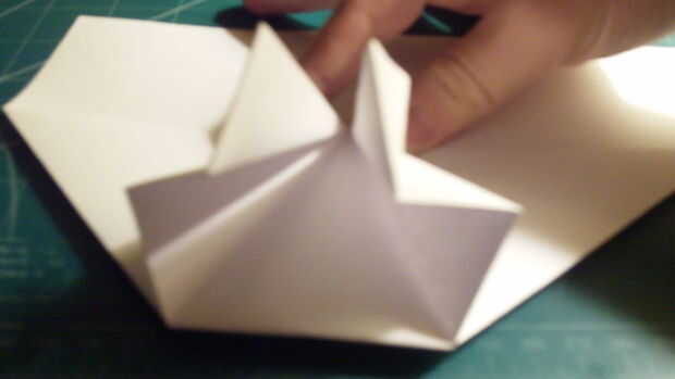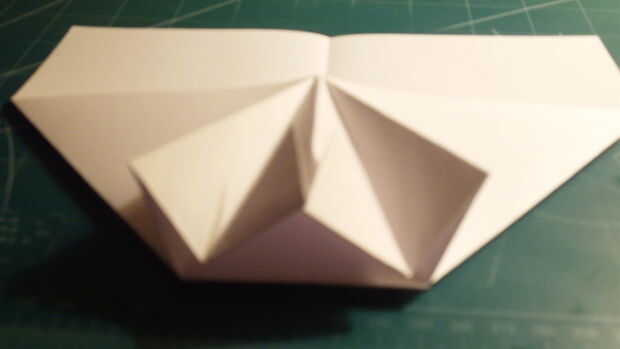 Doblar el triángulo delantero pequeño en el lado "limpio". Abierto todos pero los triángulos pequeños en el otro lado por lo que aparece casi tan plano como lo fue.