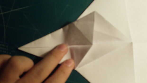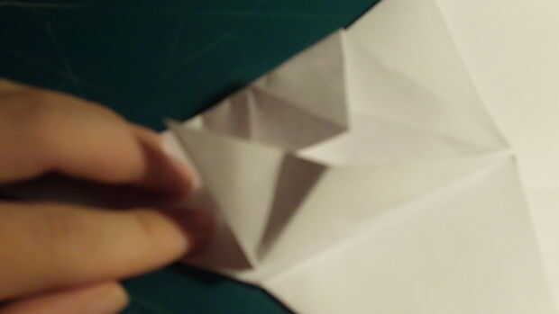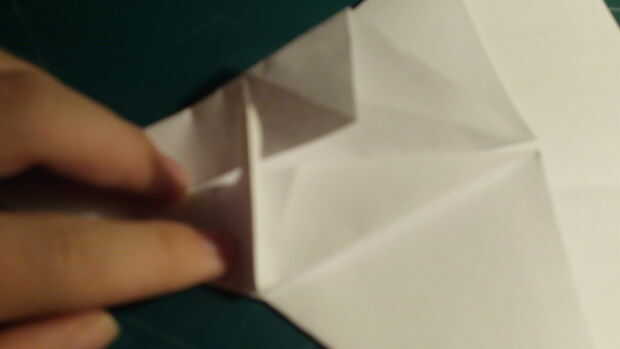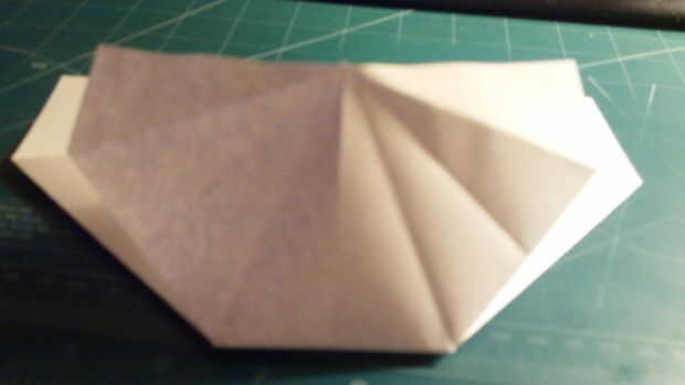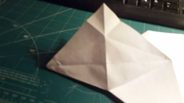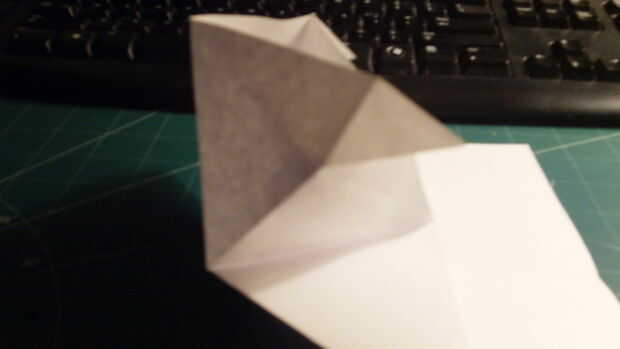 Desde la punta delantera contundente, tire del papel hacia adelante y luego aplanar y doblar como en la imagen. El libro vendrá abajo a cada lado para componer dos capas separadas. Una vez que se aborda la parte frontal comienzan a doblar hacia delante el papel trasero. Una vez que has tirado hacia adelante, dos triángulos se forma, una a cada lado.