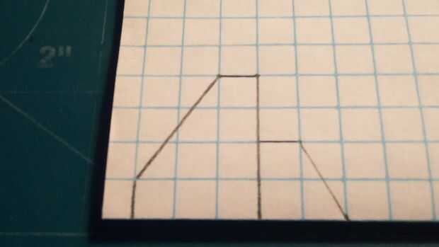 Después de que el fuselaje se hace, tomar otra hoja de papel que se dobla por la mitad a lo largo de las líneas de cajas. Marcar el ala como se muestra (1 caja de constante acorde a la raíz, con el borde posterior rectangular 1 por 3 detrás de un área de caja de 2 por 3 del ala con un barrido de 2 cajas de acorde eliminado cada 3 cajas de fuselaje). Luego cortar el ala. Medir 2 cajas a lo largo del pliegue, medir dos cajas hacia arriba de una marca y hacer otro punto. Luego trace una línea diagonal conectar esta nueva marca a la que más lejos. De la marca que acaba de realizar, medir una caja más lejos de la ahora conectado a la línea y haga una marca. Esboce una línea entre esta marca y la otra marca a lo largo del pliegue. Luego corte los estabilizadores horizontales.