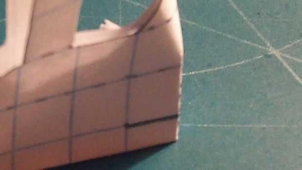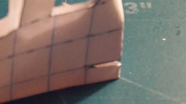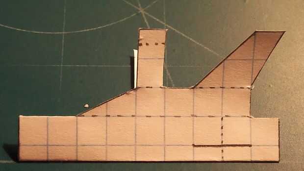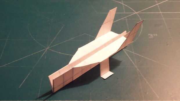 Empezar a hacer el fuselaje de su fuselaje lo cortando y doblando el contrapeso. A continuación, cortar a lo largo de la línea horizontal como se muestra. Una vez hecho esto, el estabilizador vertical hacia adelante a lo largo de la línea vertical punteada del doblez y plegar el tren de aterrizaje y mástiles. A continuación se despliegan. Una vez este finalizado, cinta de designado.
