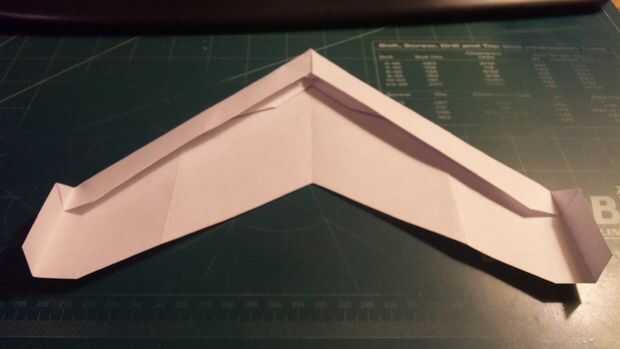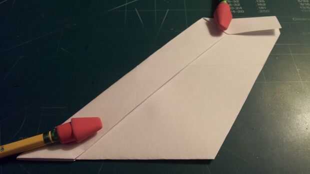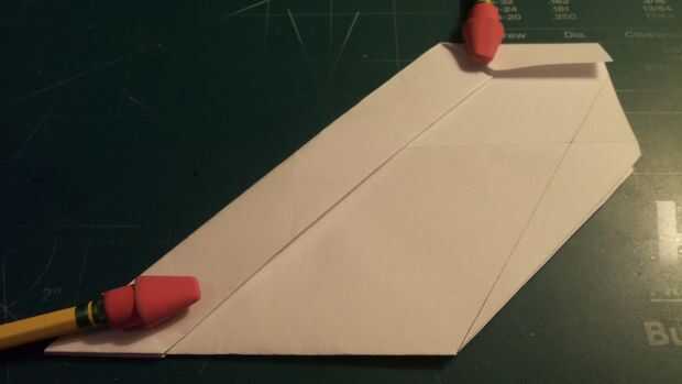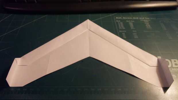 Doblar los extremos del ala a los bordes interiores de los perfiles como se muestra. Esboce una línea entre la punta de las aletillas y el endge que se arrastra del ala en el pliegue del centro, luego corte a lo largo de esta línea. Puede descartar los ajustes resultantes. Aplique cinta de designado.