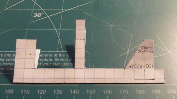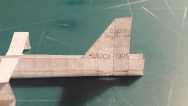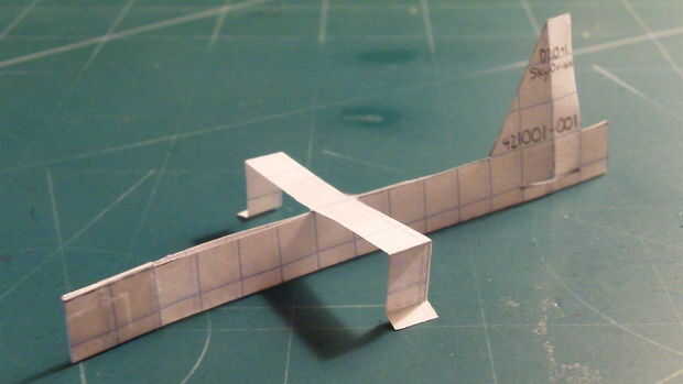 Después de haber cortado todo el fuselaje. Comenzar a doblar por la línea punteada. Luego doblar como indica la segunda línea la parte trasera del avión acartonados los 2 trasera delantera y cortada a lo largo de la línea. Hacerlo doblando el fuselaje a la derecha, hacer un corte y repetir el doble a la izquierda. Entonces cinta su fuselaje juntos en el frente, hacia atrás y a través del fuselaje en la aleta.