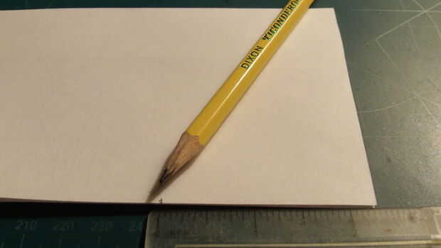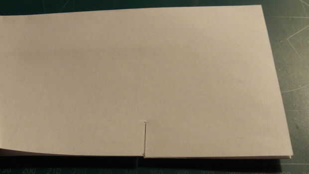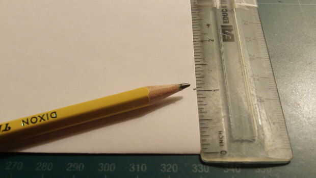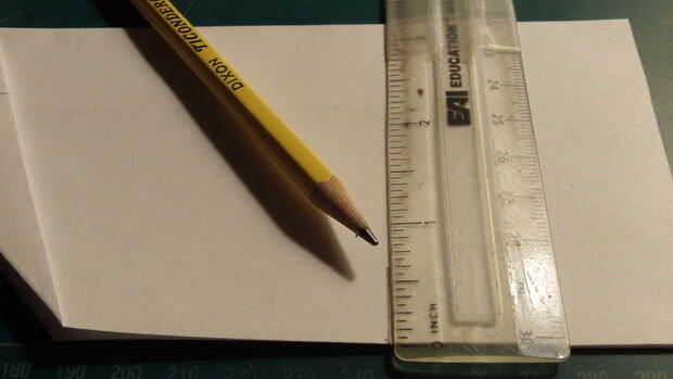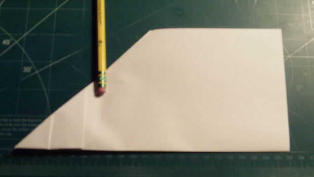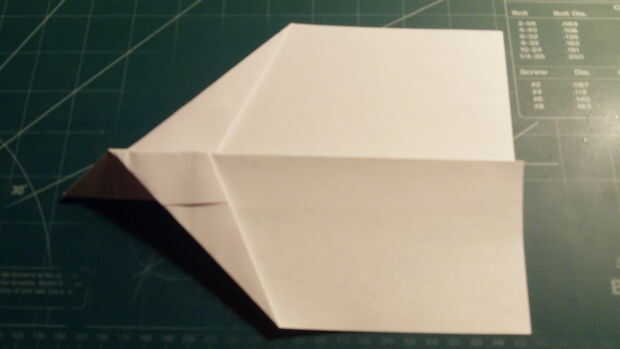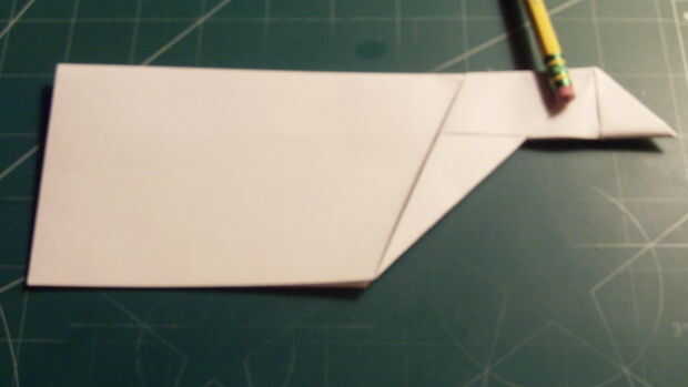 Medida y hacer una marca de 1 pulgada por encima del pliegue del centro a lo largo del borde posterior. Doblar el ala raíz se extiende entre esta marca y la parte superior de la punta de la nariz. Cuando las dos alas se pliegan hacia abajo, miden 2,25 pulgadas hacia adelante desde el borde de fuga a lo largo de la punta del ala y haga una marca. De la marca, medir 0,625 pulgadas hacia adentro y dibuje una línea. Luego corte a lo largo de esta línea.