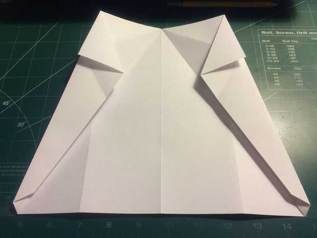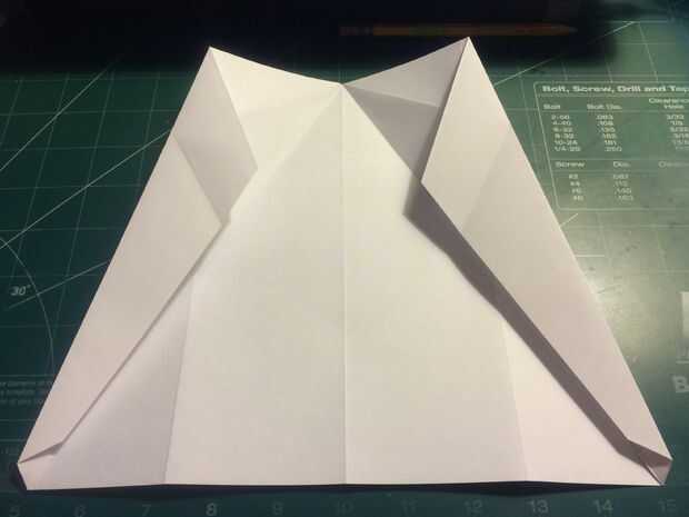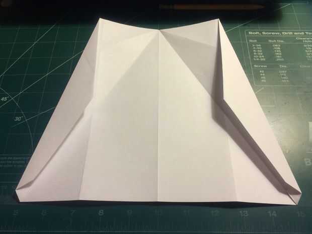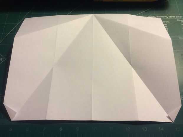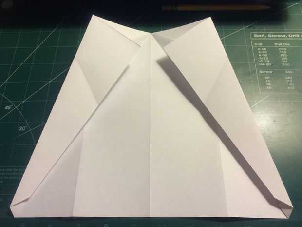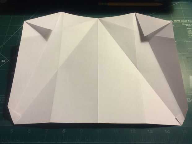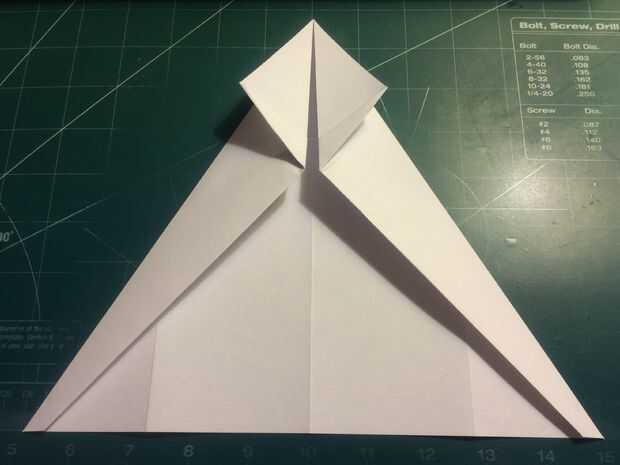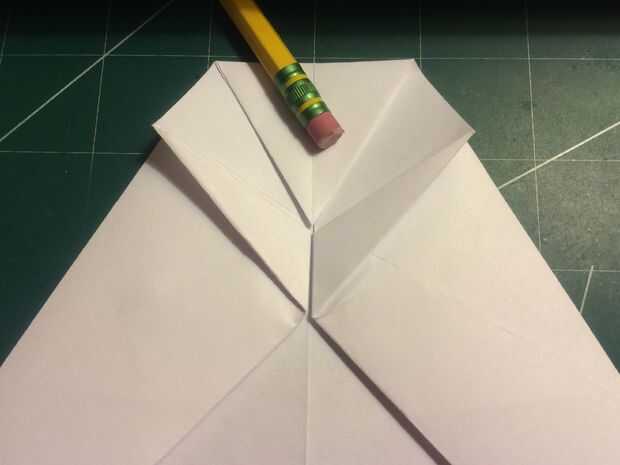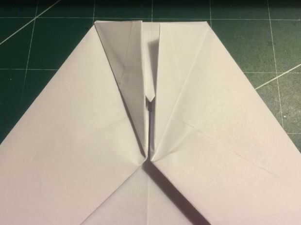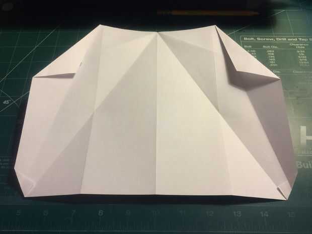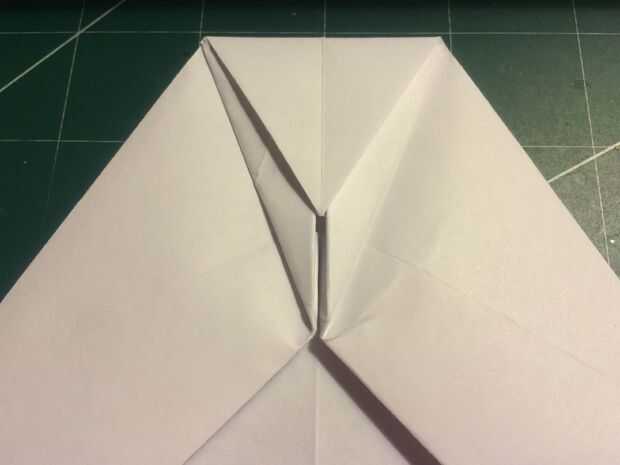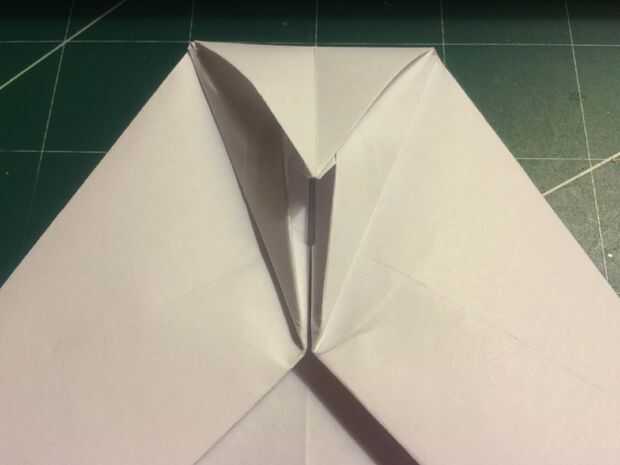 Retire la punta de la nariz hasta el borde delantero de porción densa de doble de diamante. Doblar los bordes de fuga de los pliegues del diamante en el centro y luego métalos en el pliegue de la nariz como se muestra.